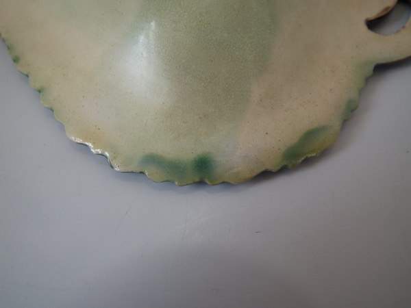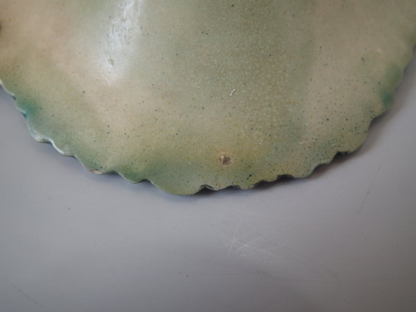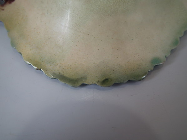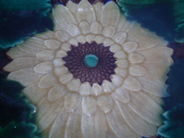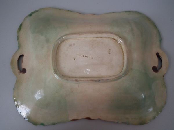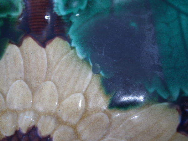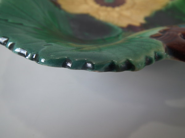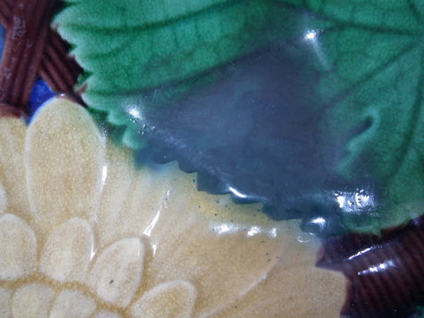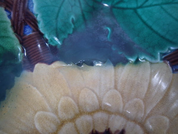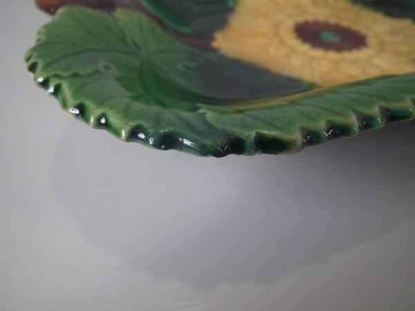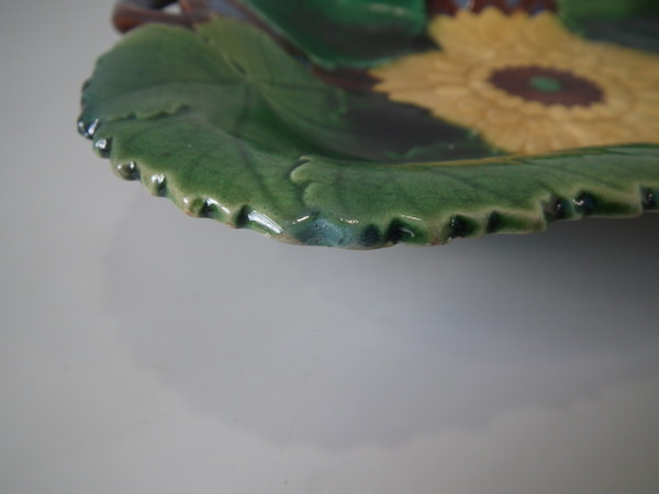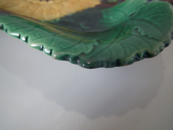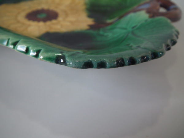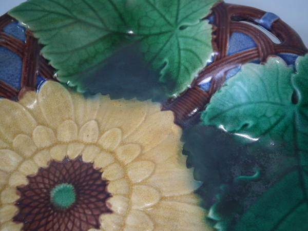 Victorian, circa 1883. 8.3ins high, 10.8ins wide, 1.6ins depth. Wedgwood Majolica platter which features a sunflower in a basket.