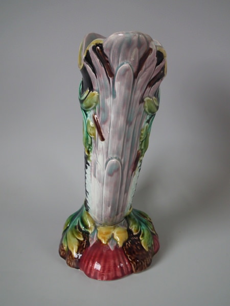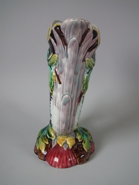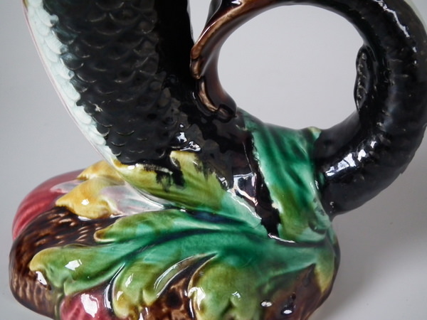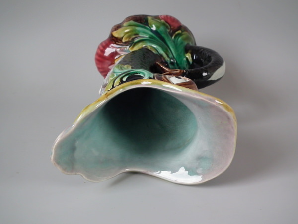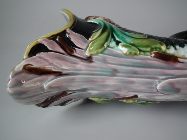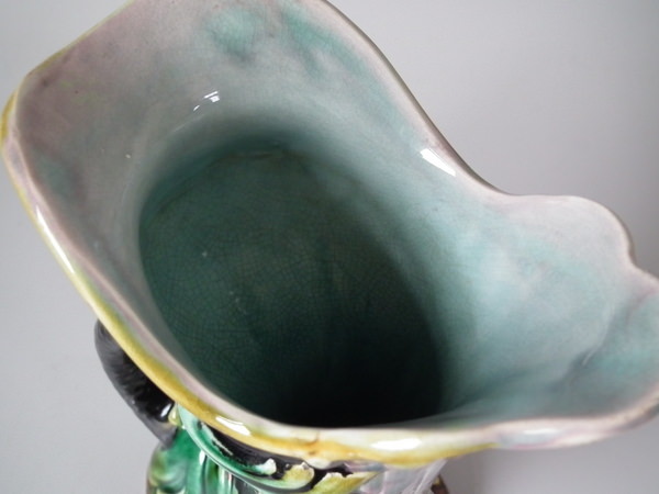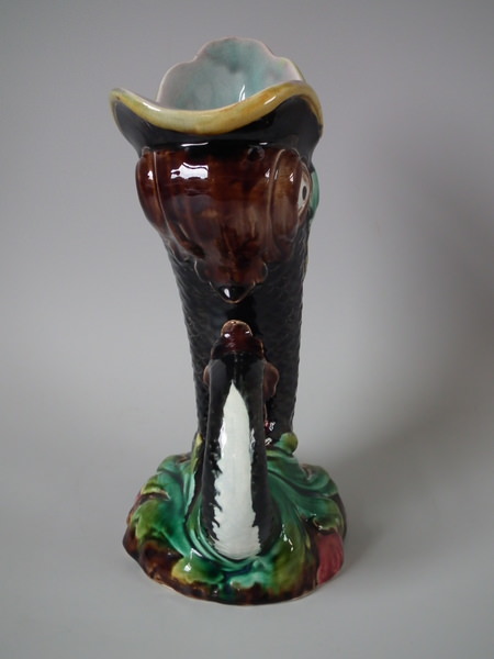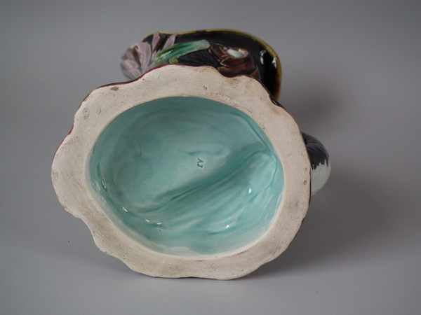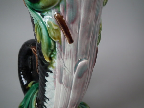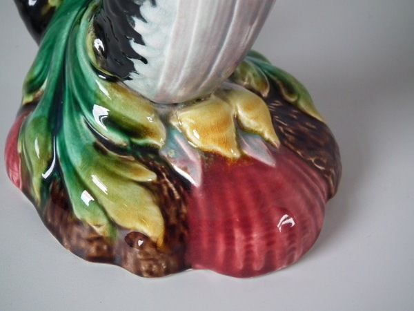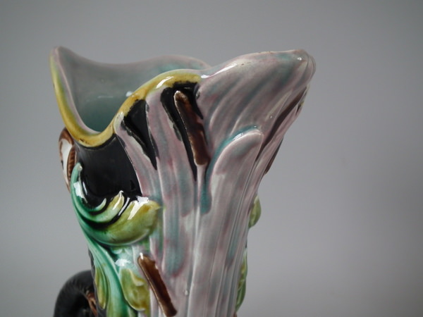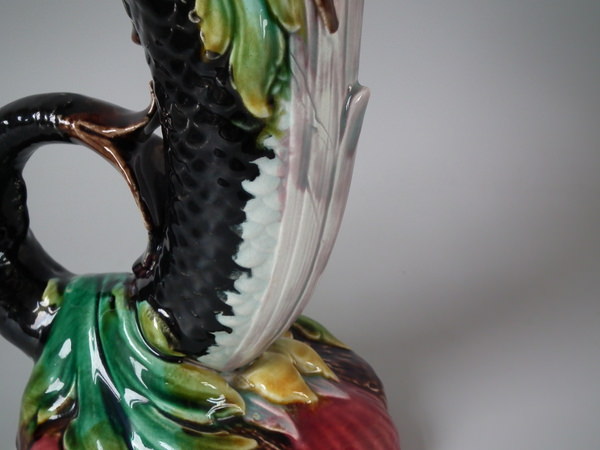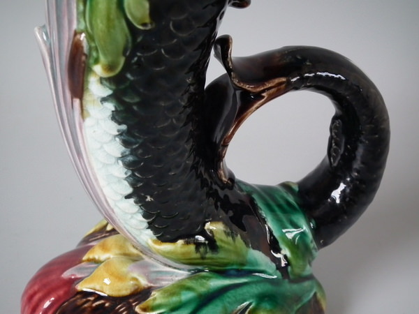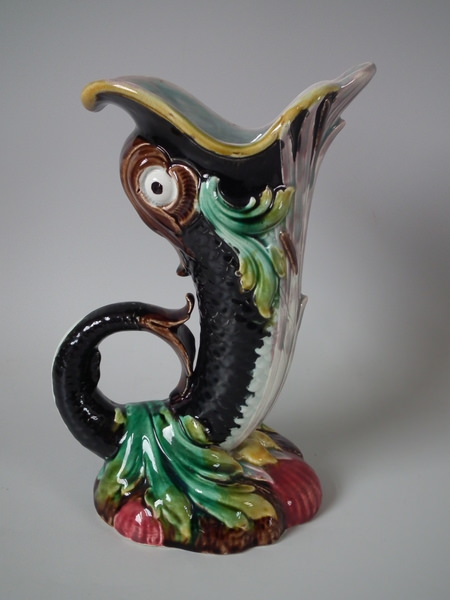 Victorian, circa 1880. 9.4ins high, 6.3ins wide, 4.5ins depth. Gustafsberg Majolica jug/pitcher which features open mouthed fish on a shell and seaweed base.