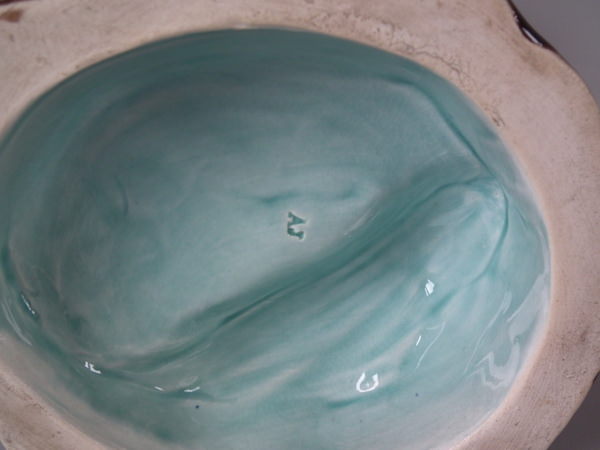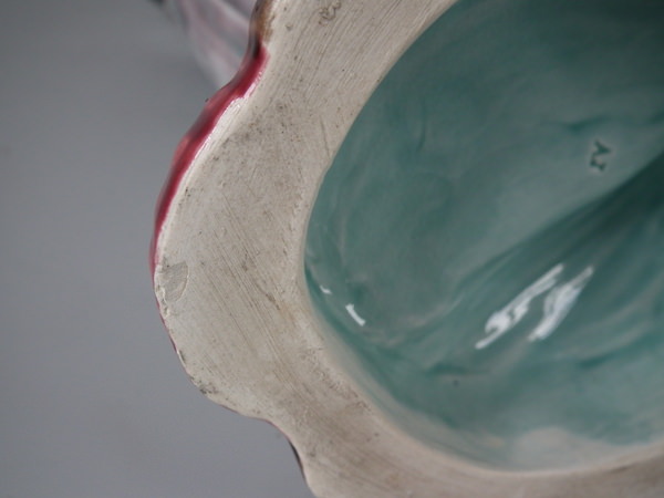 KILN EFFECTS: shrinkage line along the mold join to the fish's lower lip;