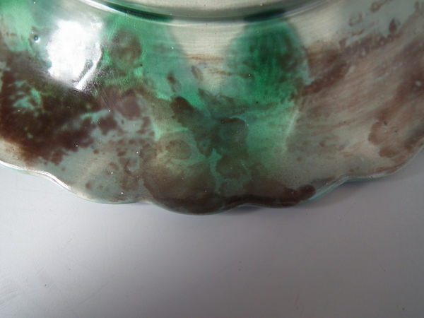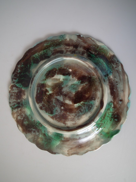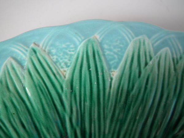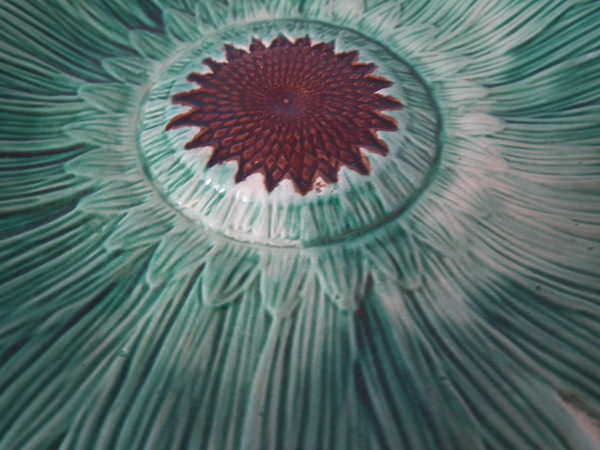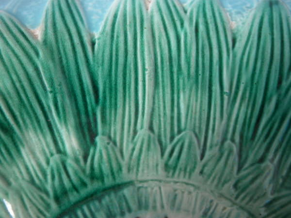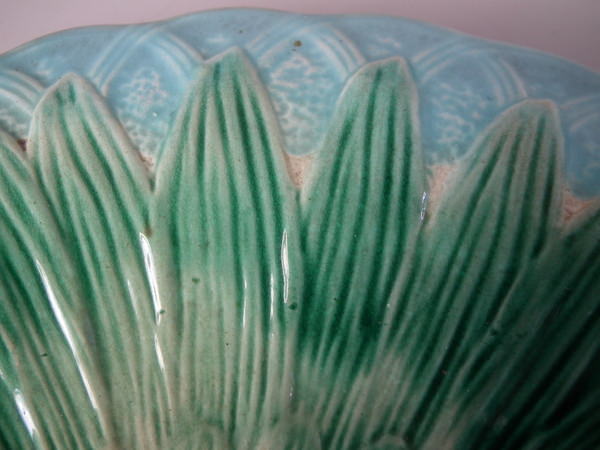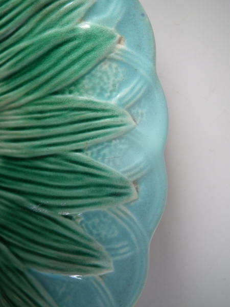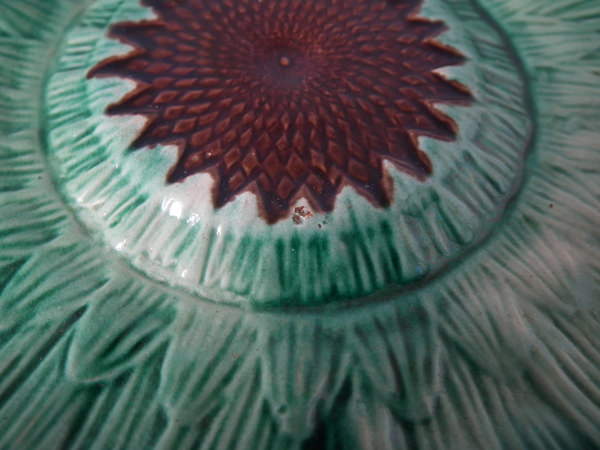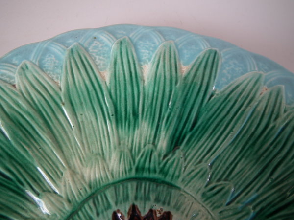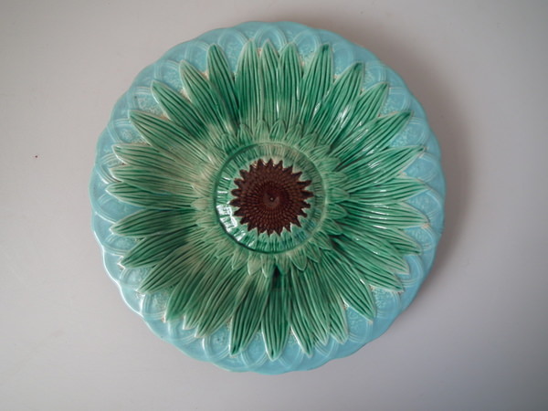Victorian, circa 1880. 8.7ins high, 8.7ins wide, 0.8ins depth. Unidentified English Majolica plate which features a sunflower in a basket.
