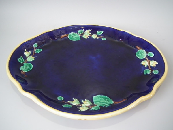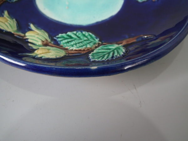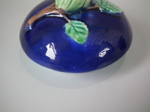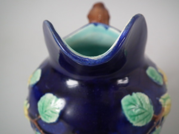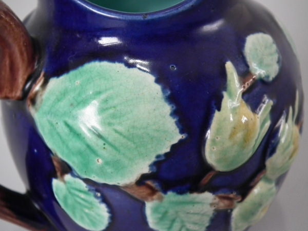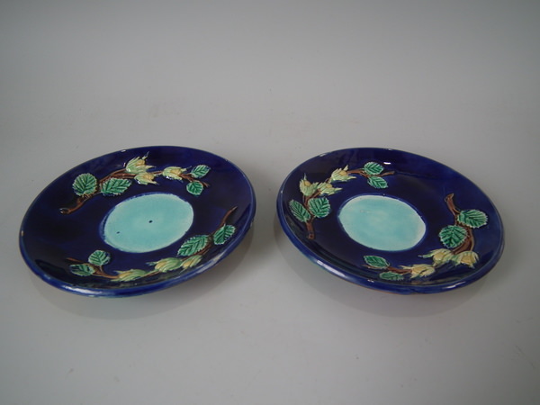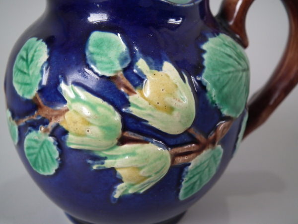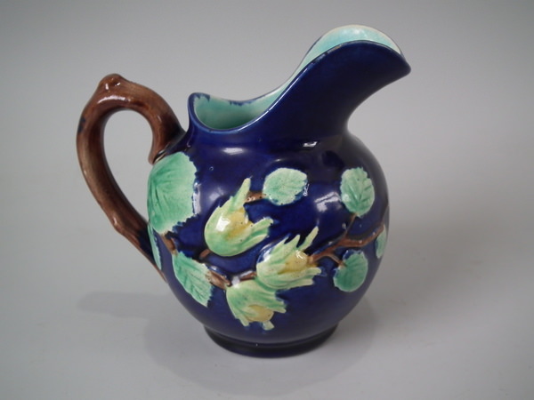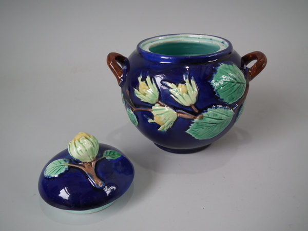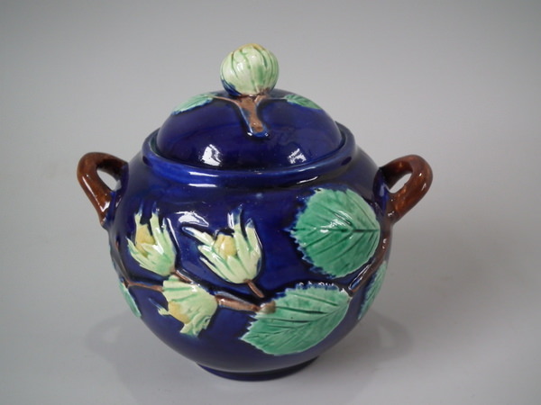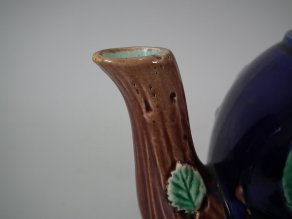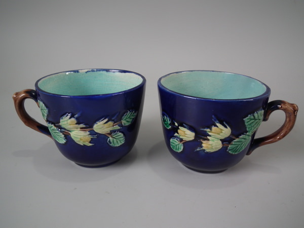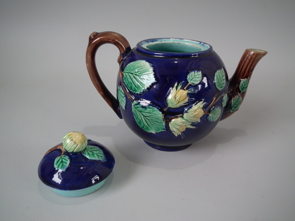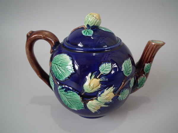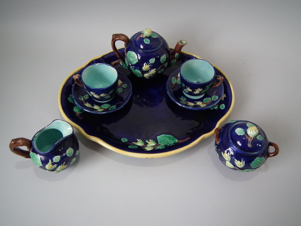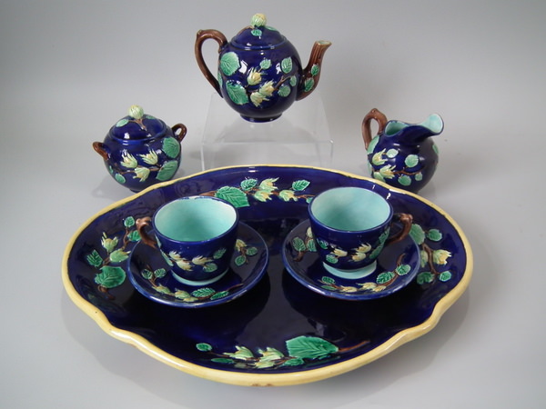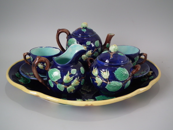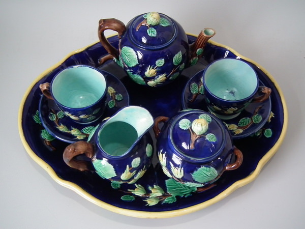 Forester Majolica tea set which features a tray, two cups with saucers, a milk jug, a sugar bowl and a teapot, all with chestnut decoration.