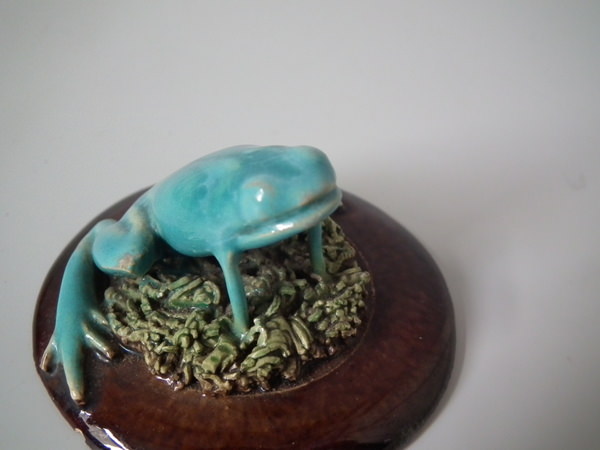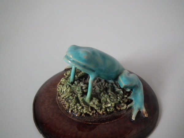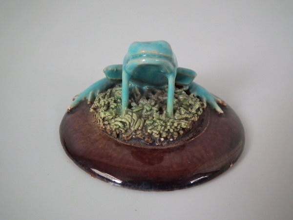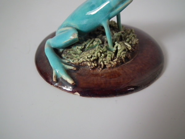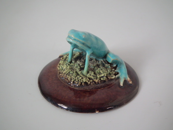 Victorian, circa 1890. 1.4ins high, 2.4ins wide, 2.4ins depth. Portuguese Palissy Majolica figural which features a seated frog.