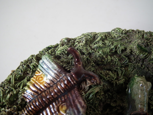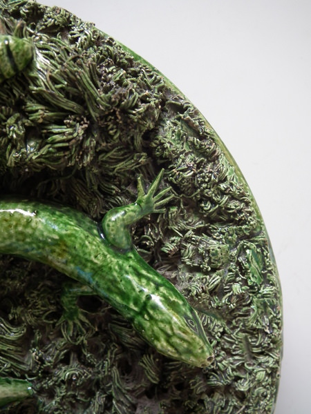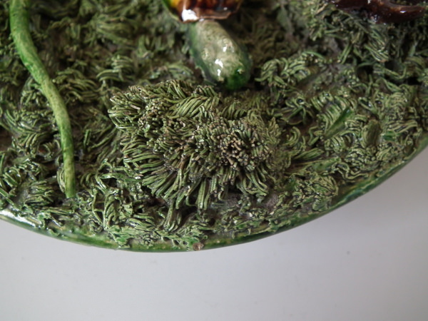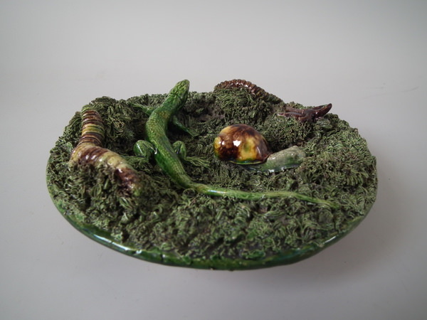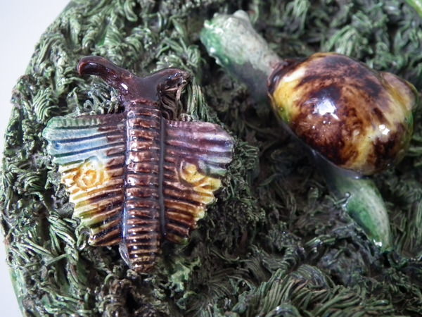 Victorian, circa 1890. 6.4ins high, 6.4ins wide, 2.4ins depth. F. Gomes D'Avellar Portuguese Palissy Majolica wall plate which features a snail, lizard, two grubs and a moth.