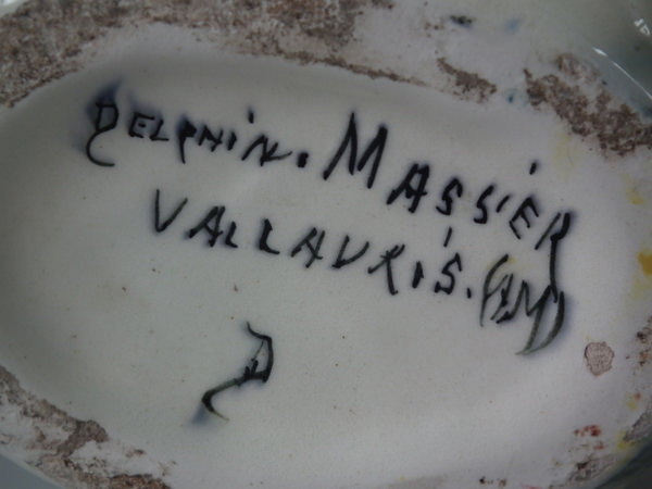 The piece bears maker's marks for the Delphin Massier pottery.