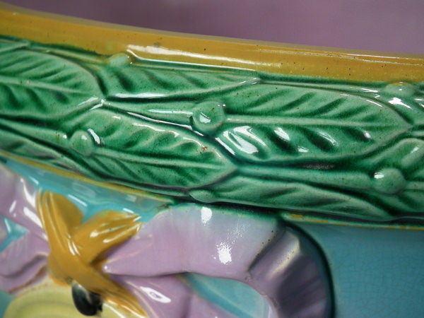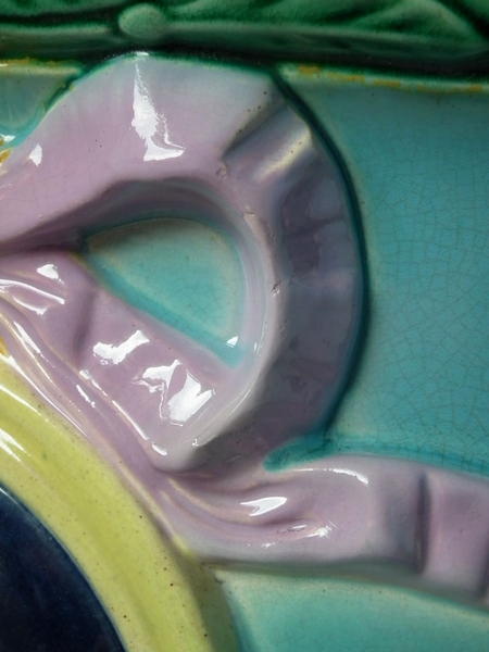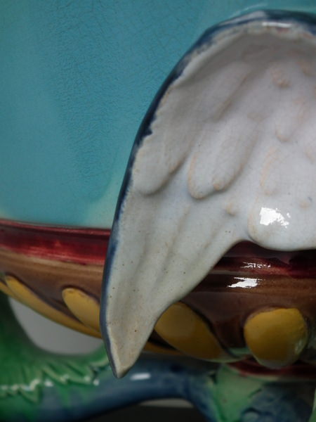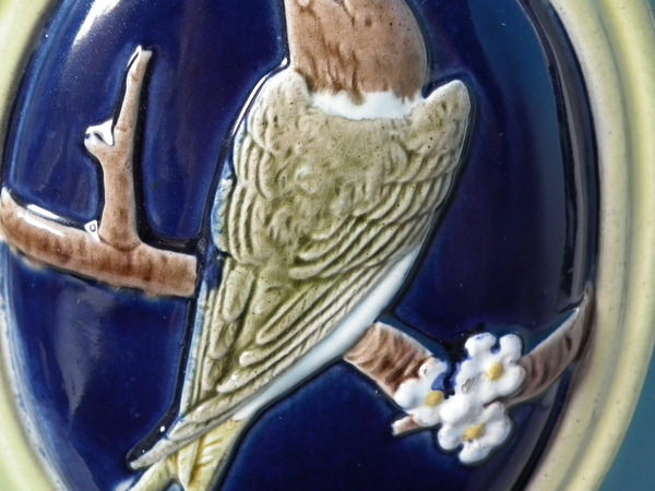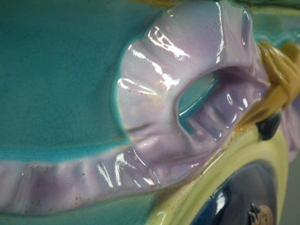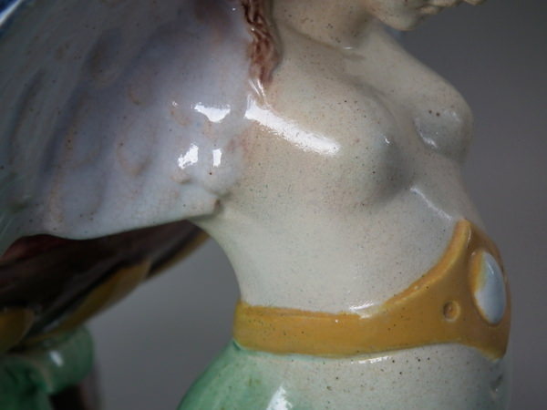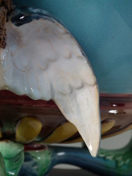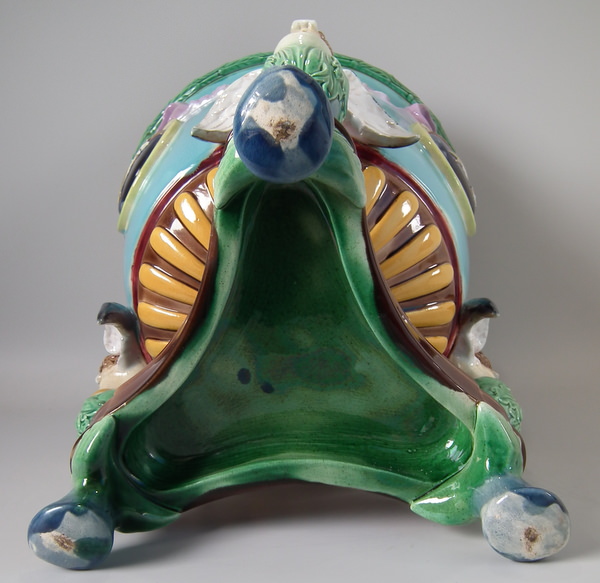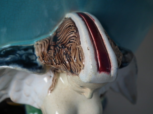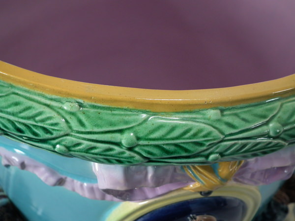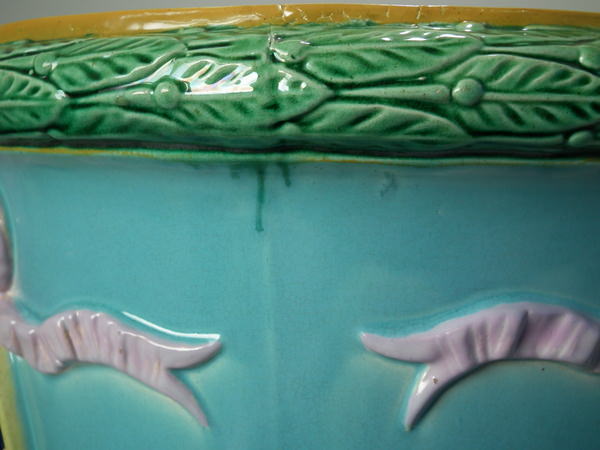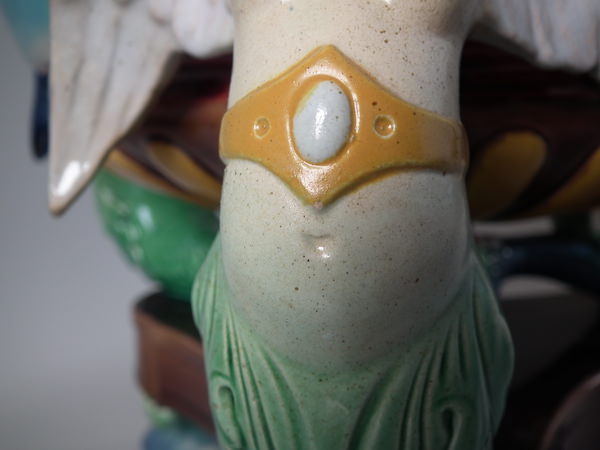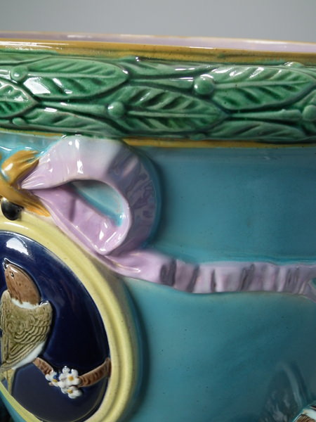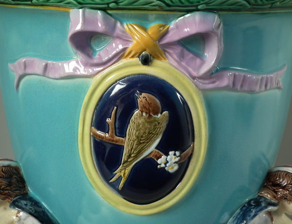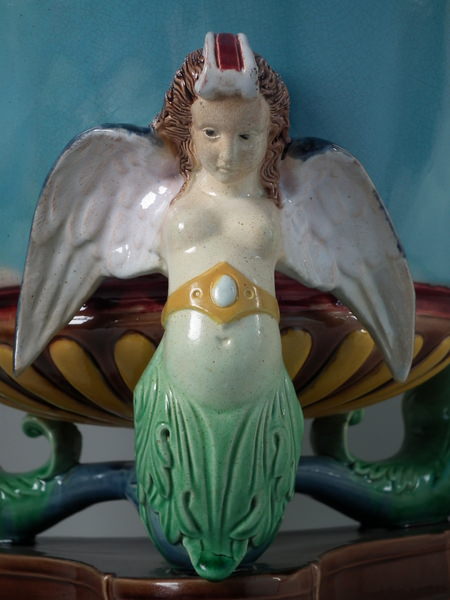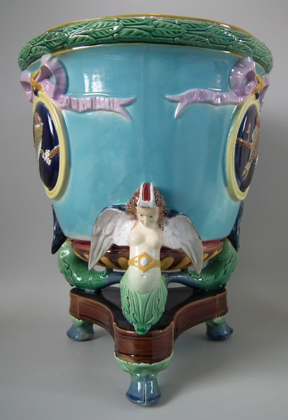 Holdcroft Majolica jardinière which features mythical winged maidens and bird decorated oval panels.