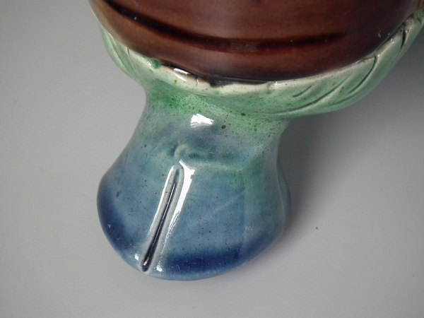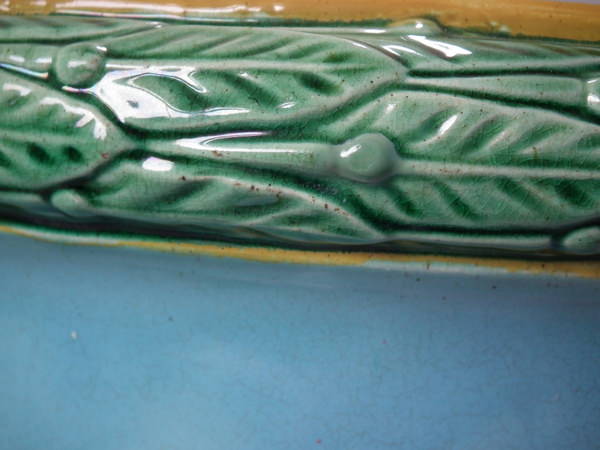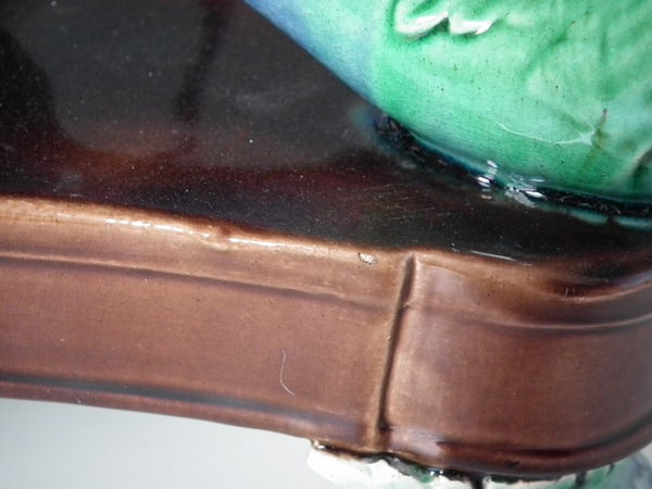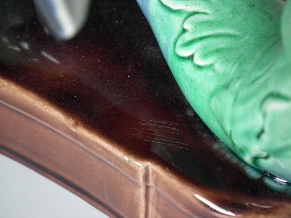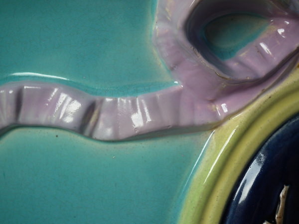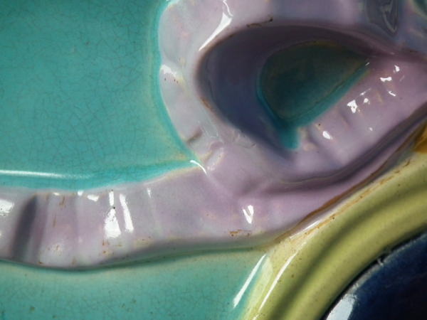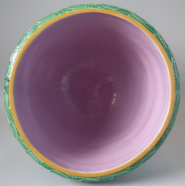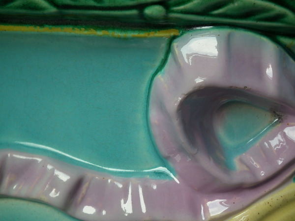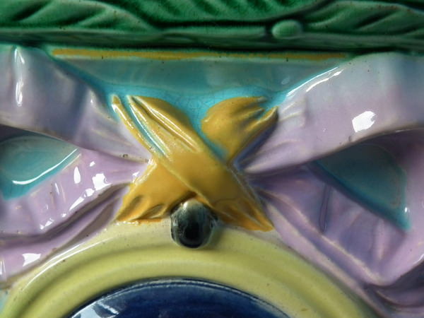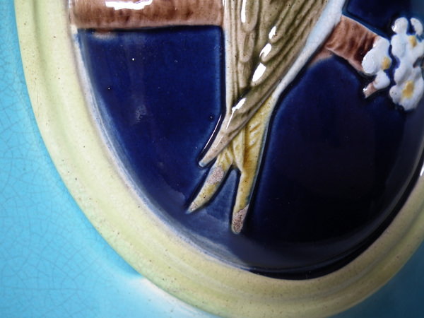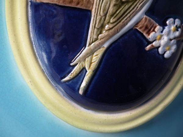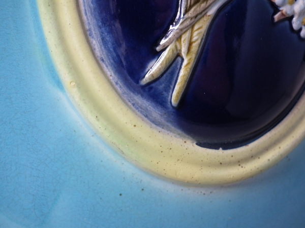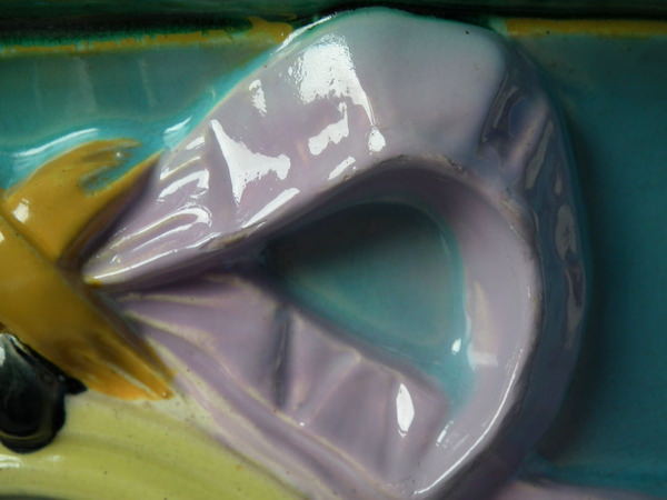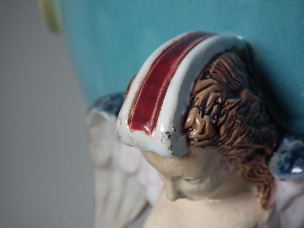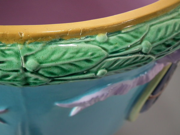 Holdcroft Majolica jardinière which features mythical winged maidens and bird decorated oval panels.