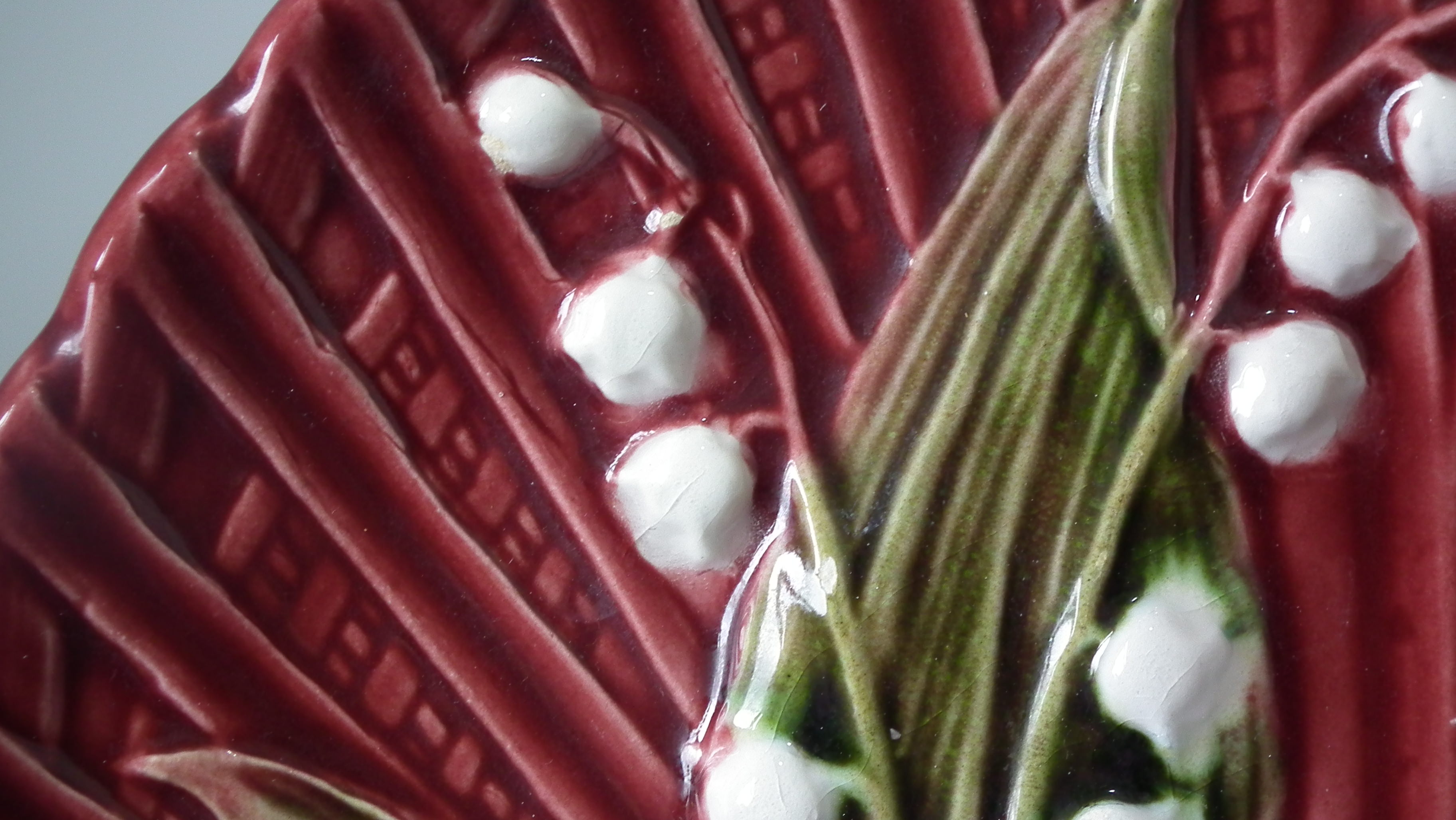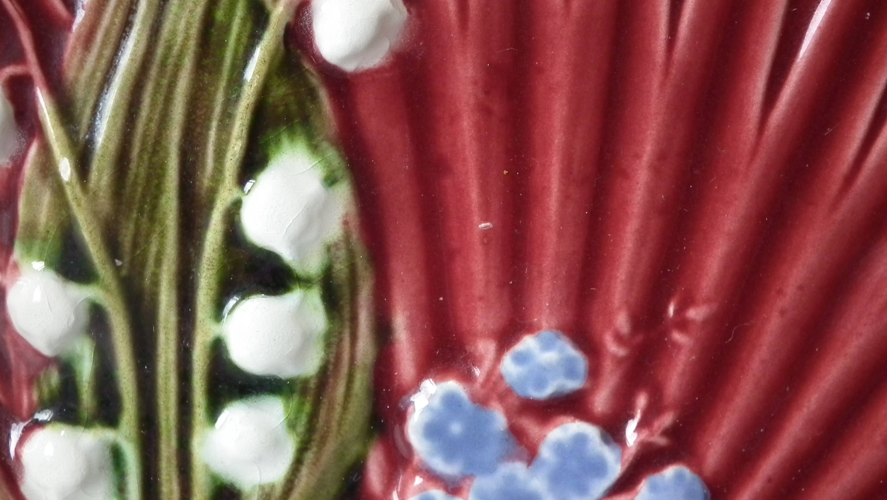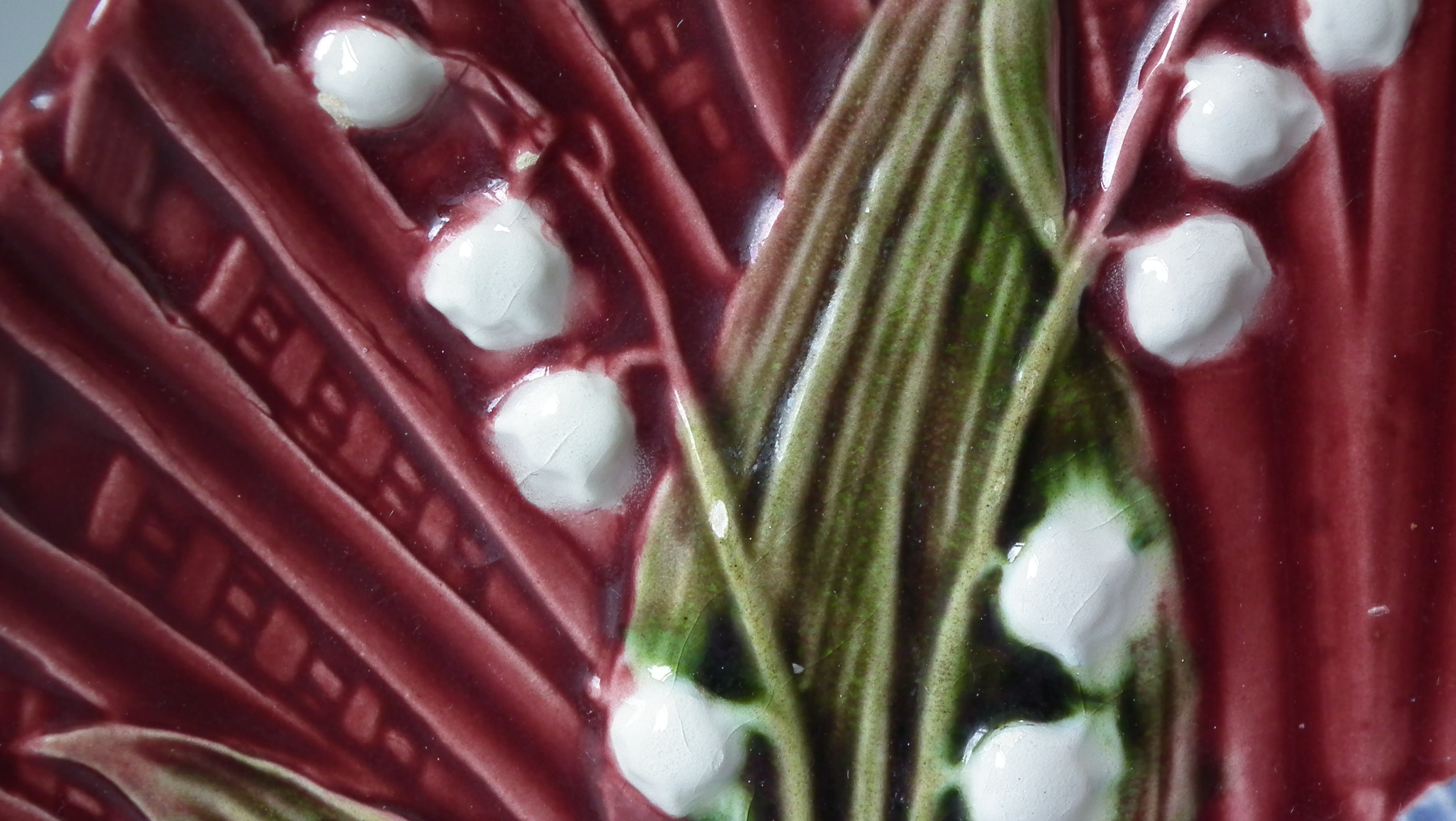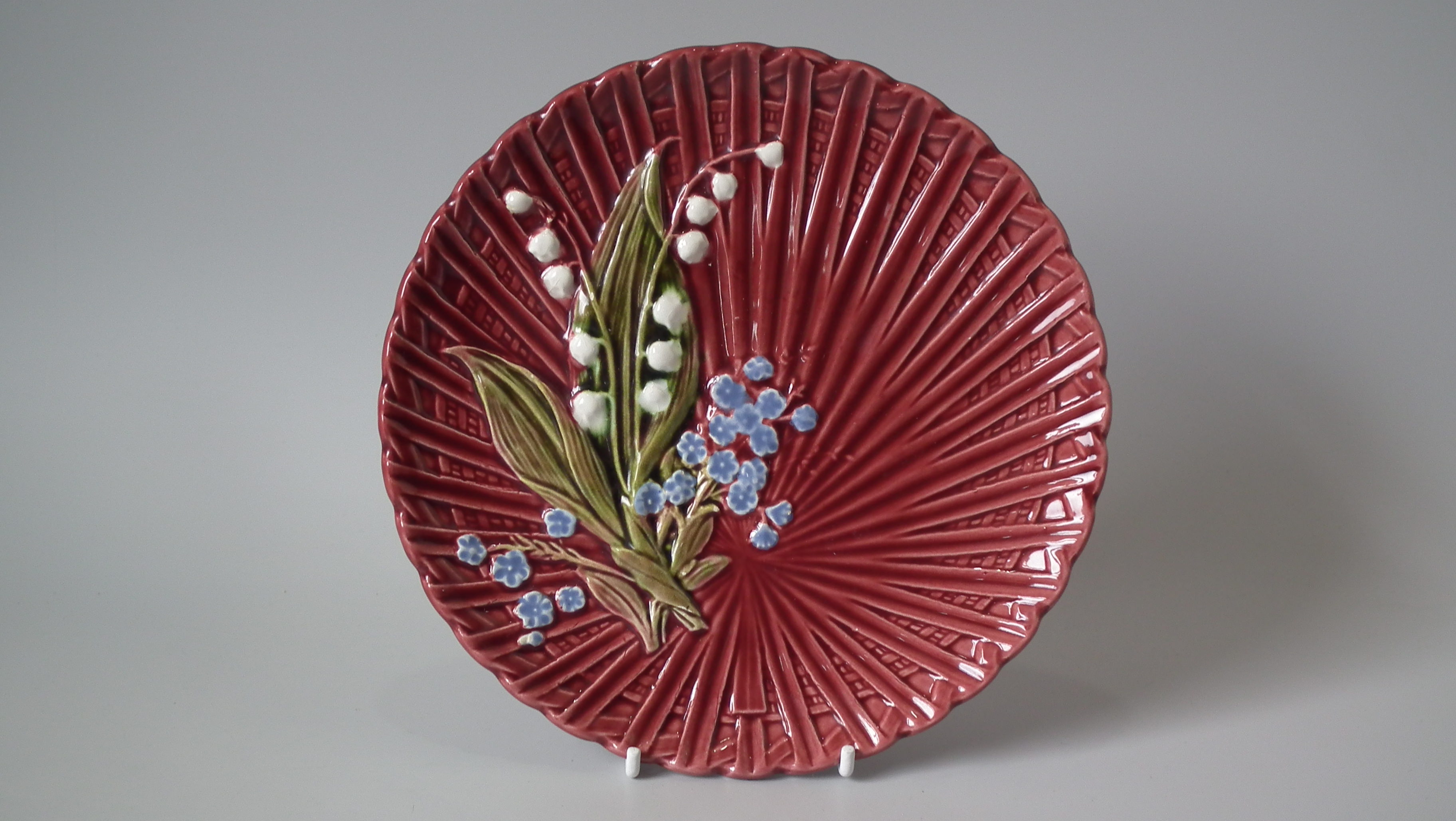 Early 20thC, circa 1920. 7.8ins high, 7.8ins wide, 0.8ins depth. Schramberg Majolica plate which features lily of the valley flowers, leaves and buds on a fan ground.
