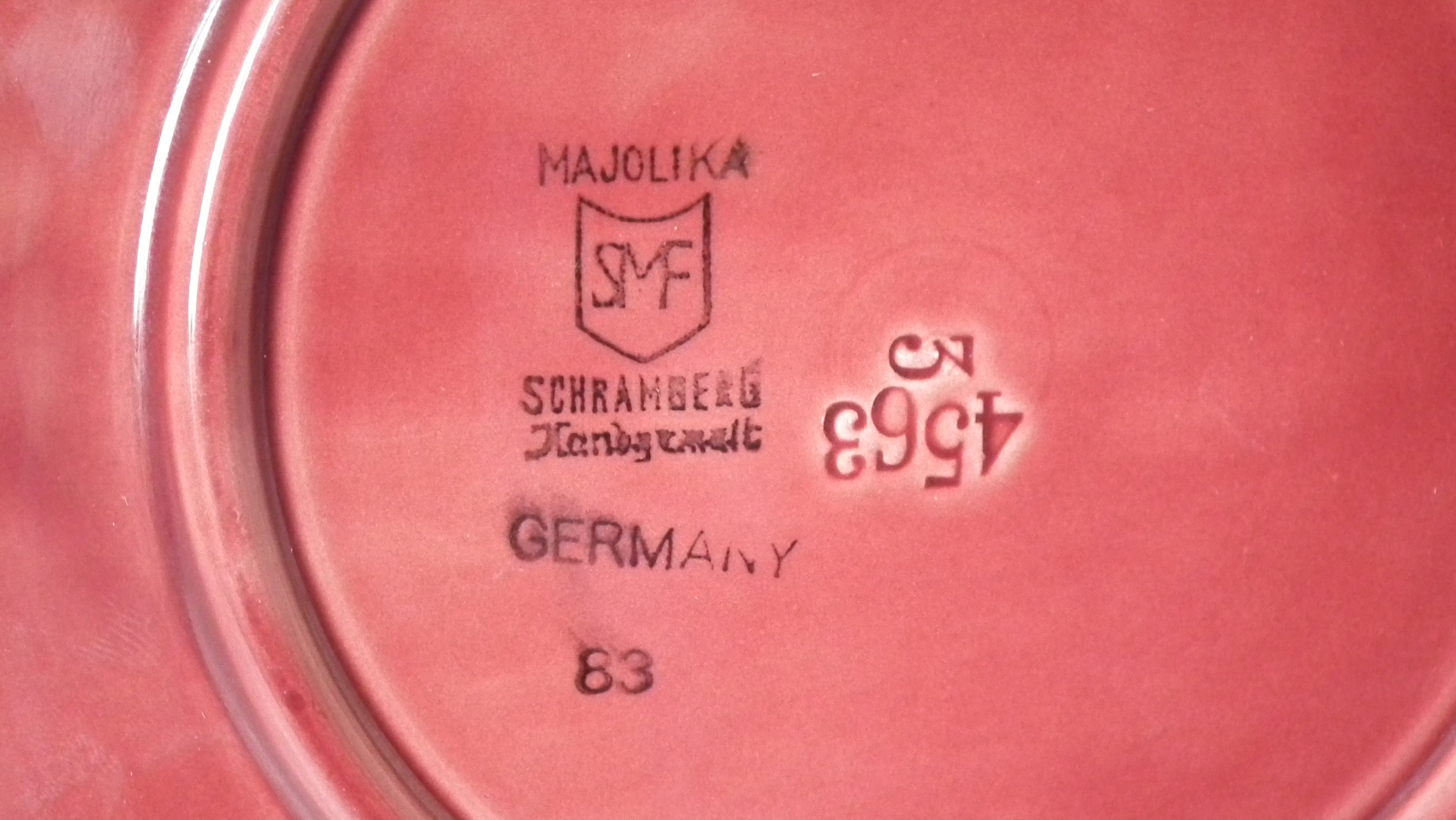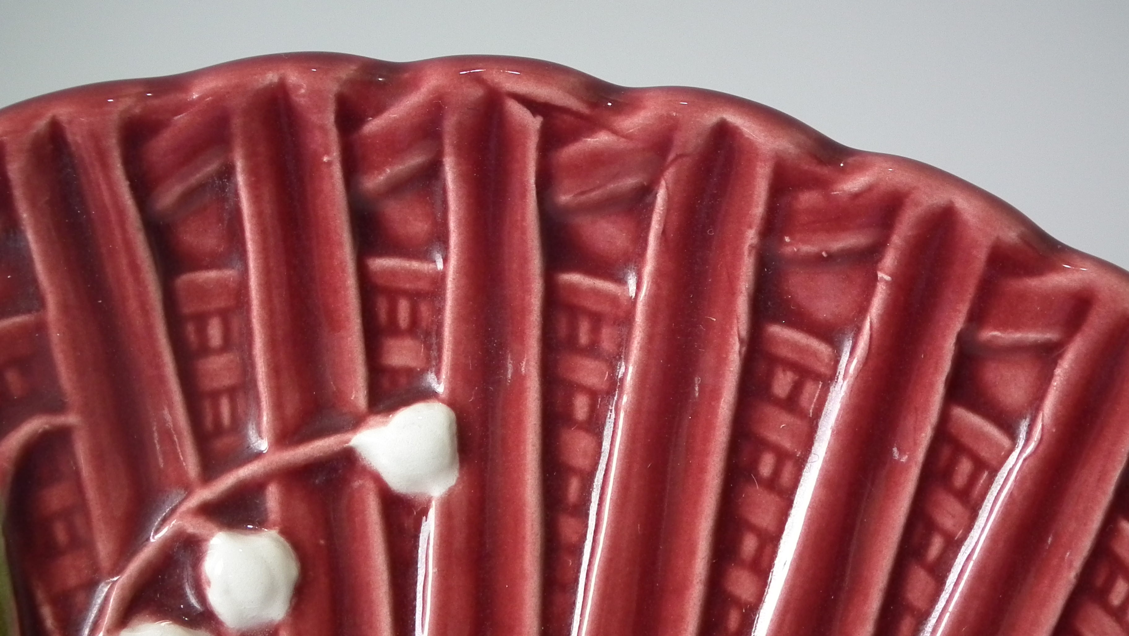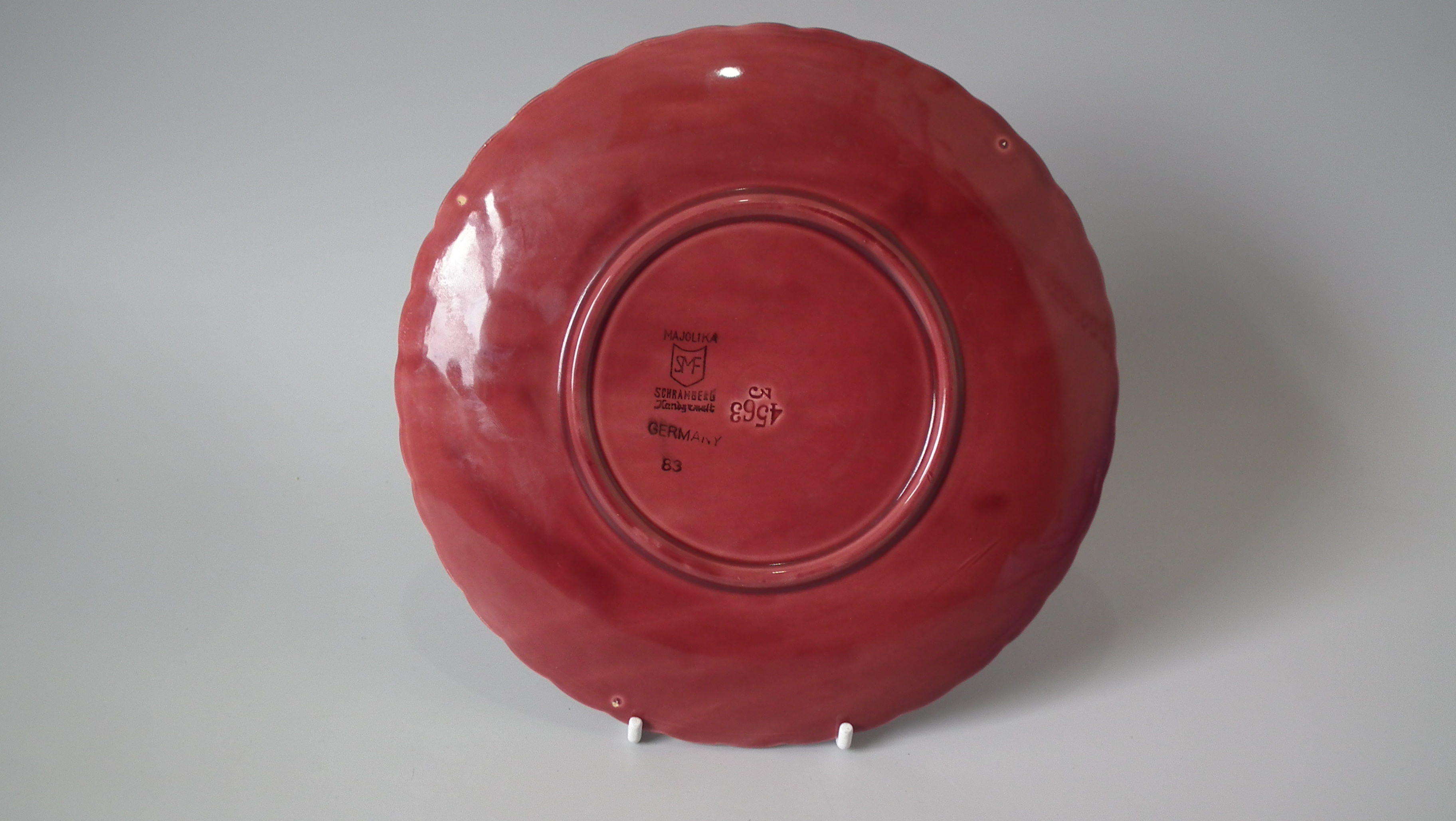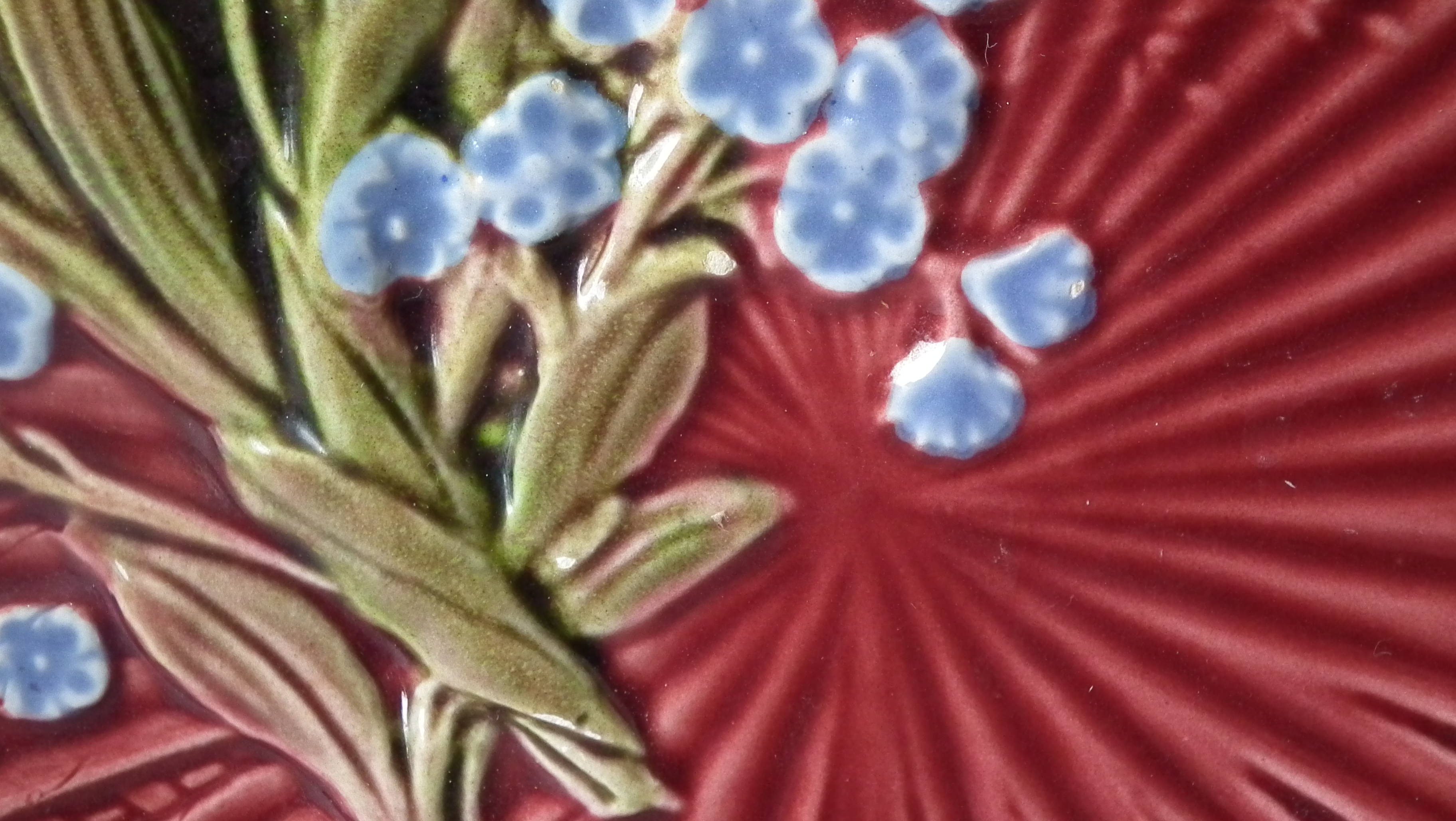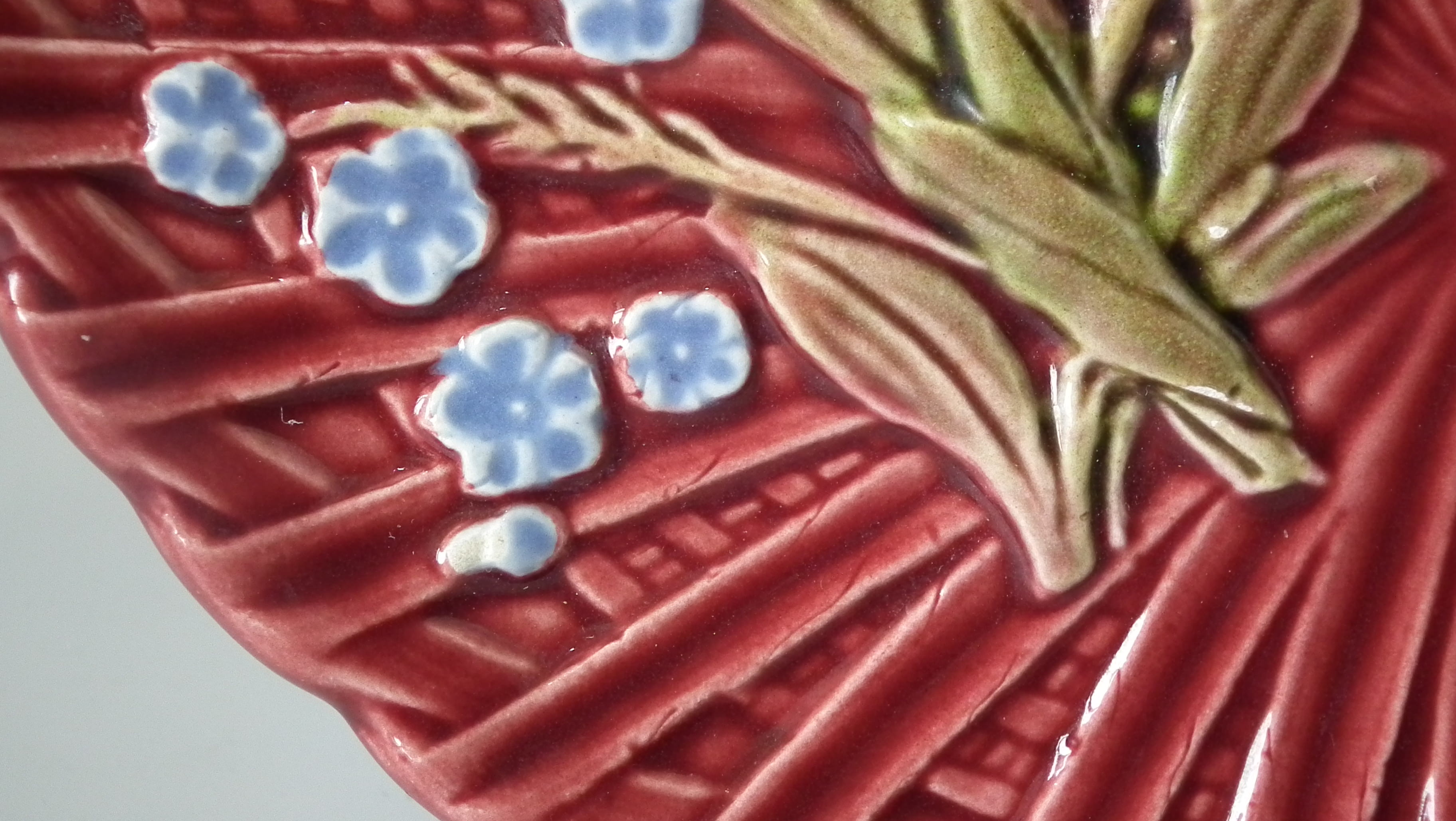 Early 20thC, circa 1920. 7.8ins high, 7.8ins wide, 0.8ins depth. Schramberg Majolica plate which features lily of the valley flowers, leaves and buds on a fan ground.