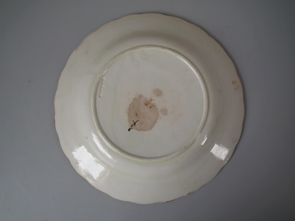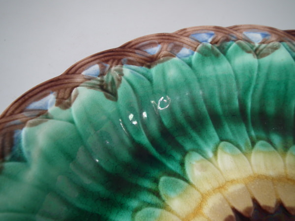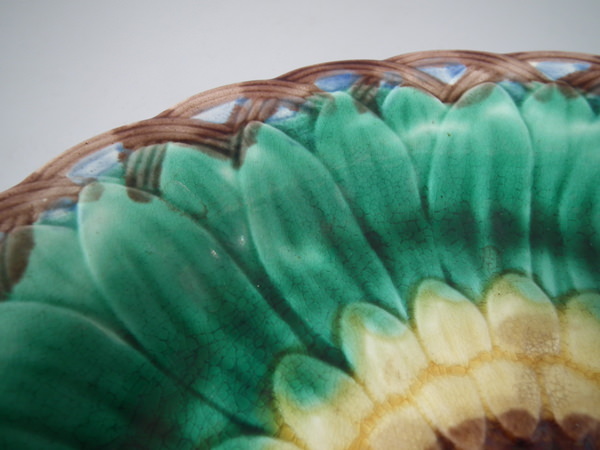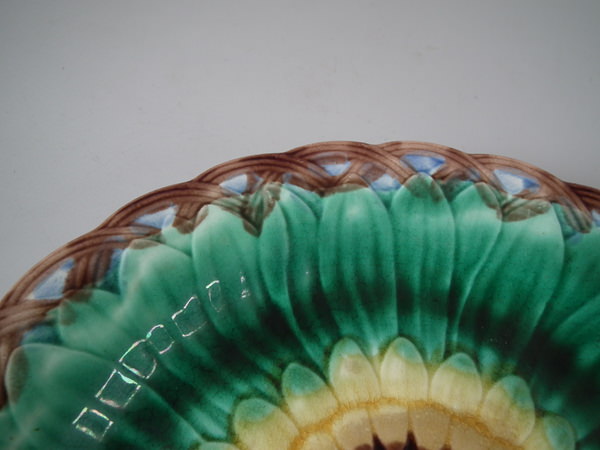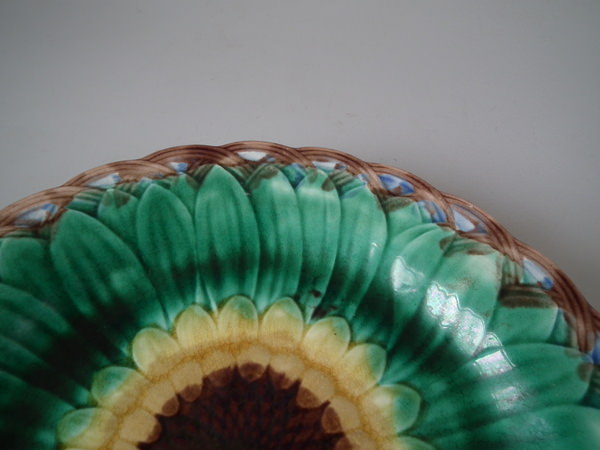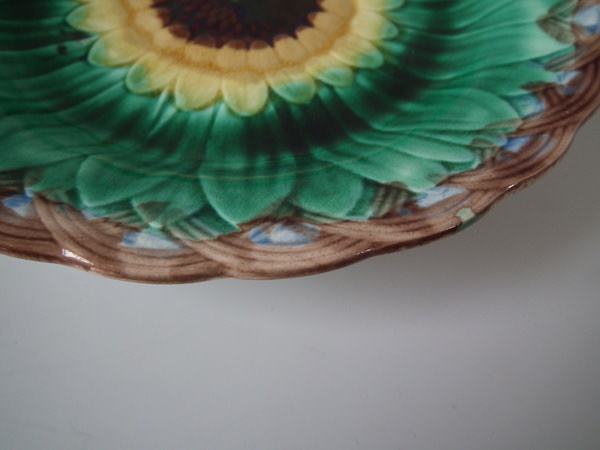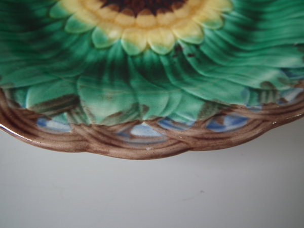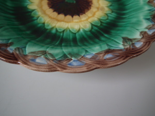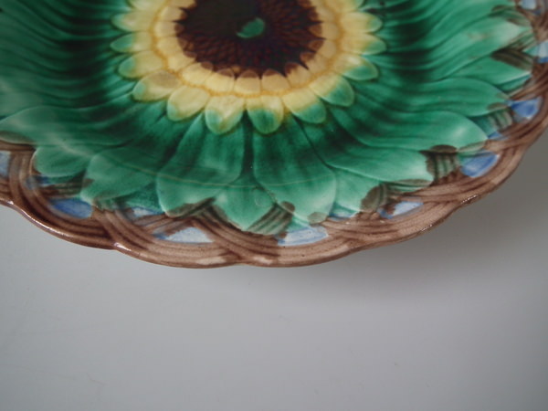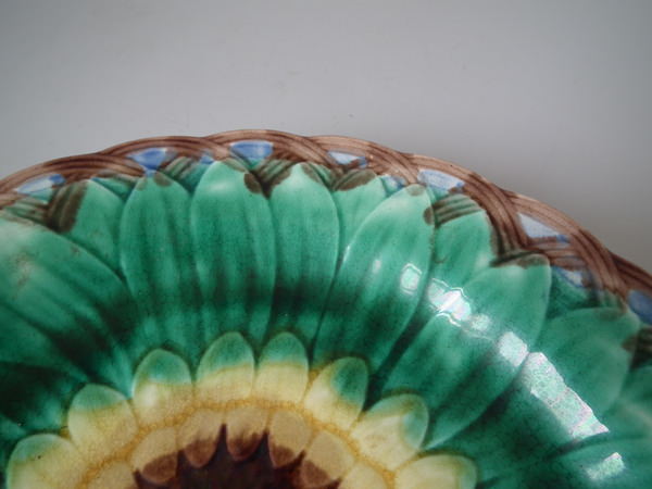 Victorian, circa 1878. 8.3ins high, 8.3ins wide, 1.2ins depth. Wedgwood Majolica plate which features a sunflower in a basket.
