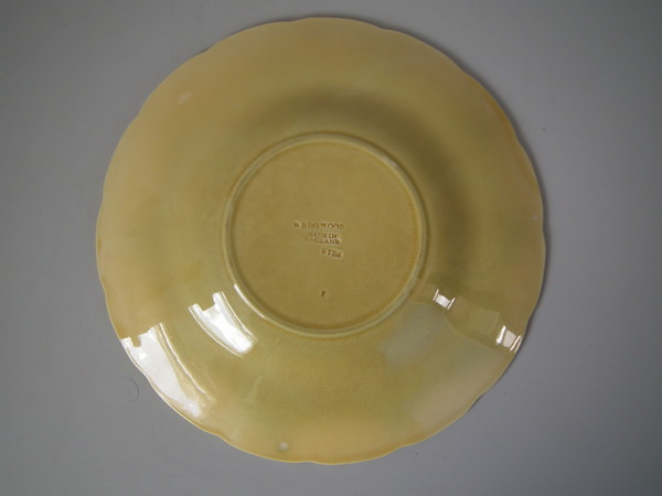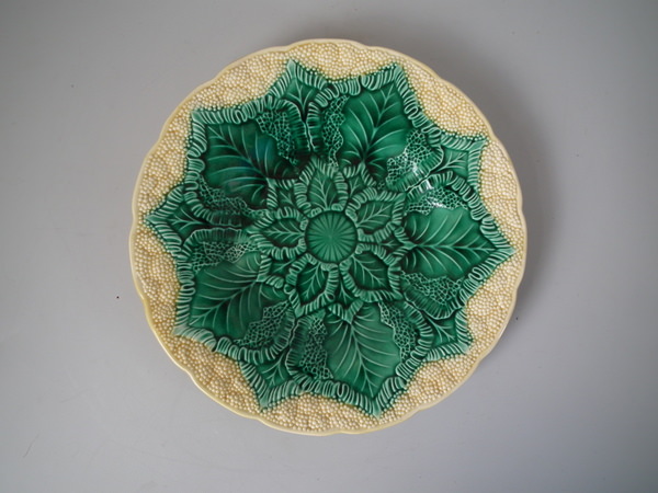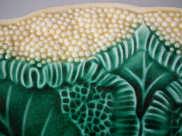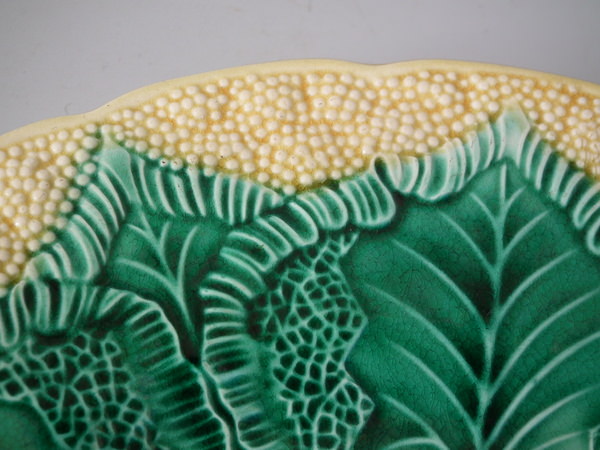 Early to mid 20thC, circa 1936. 9.1ins high, 9.1ins wide, 1ins depth. Wedgwood Majolica plate which features cauliflower leaves on a cauliflower textured ground.