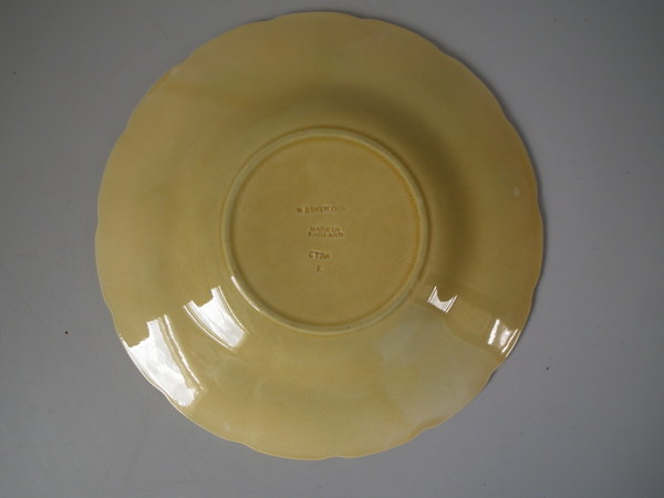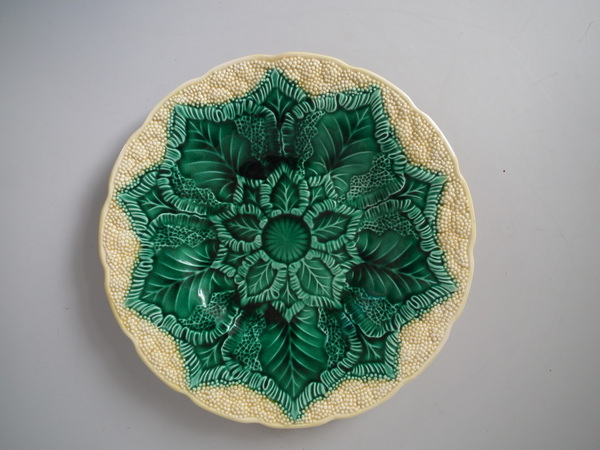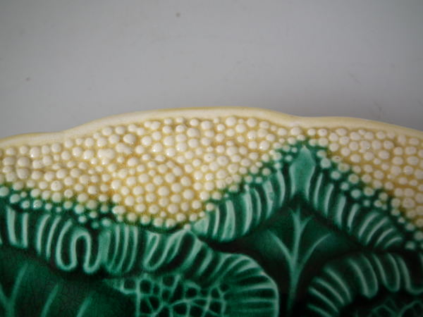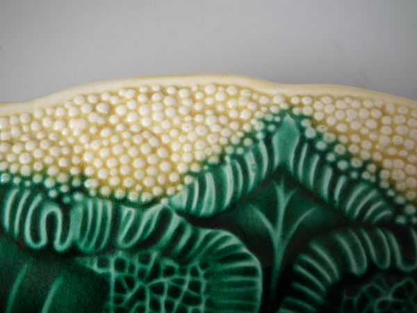 Early to mid 20thC, circa 1936. 9.1ins high, 9.1ins wide, 1ins depth. Wedgwood Majolica plate which features cauliflower leaves on a cauliflower textured ground.