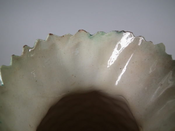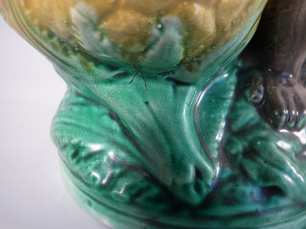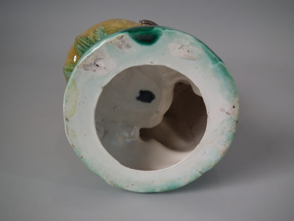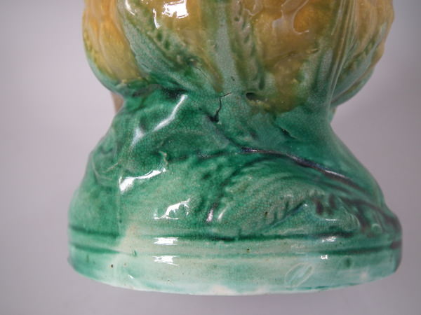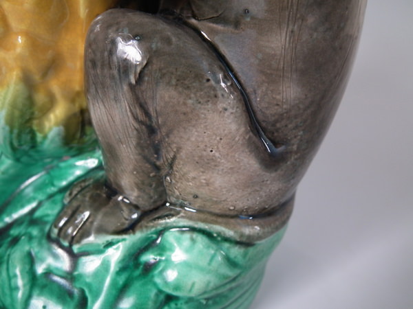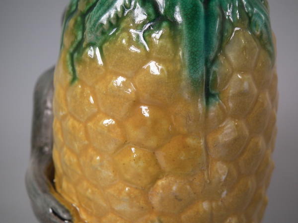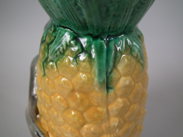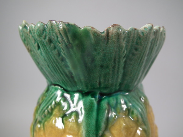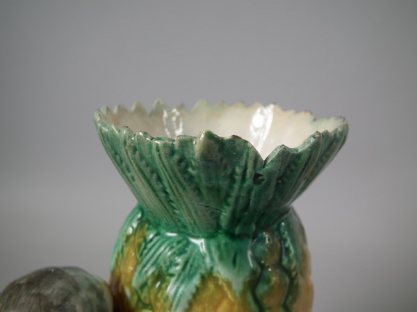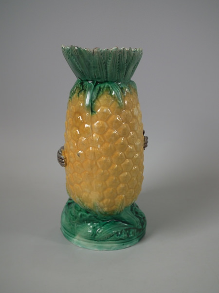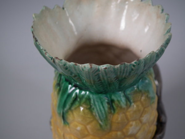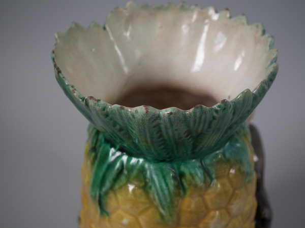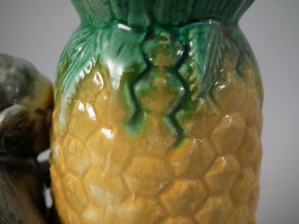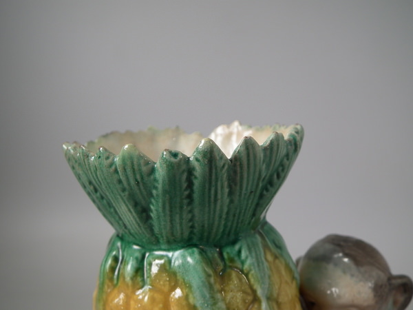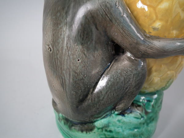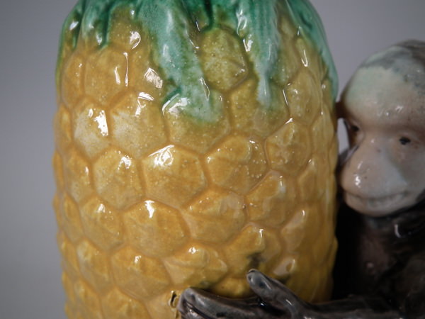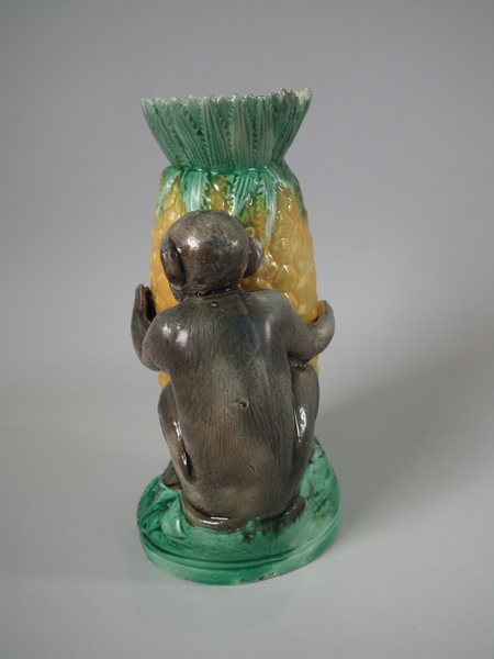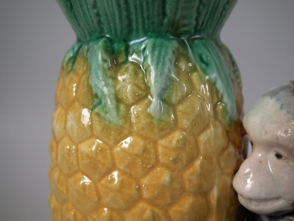 Victorian, circa 1870. 7.2ins high, 4.3ins wide, 3.5ins depth. Majolica vase which features a monkey holding a pineapple.