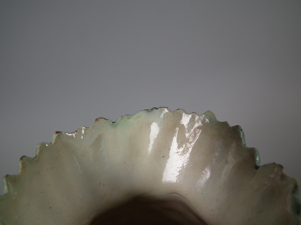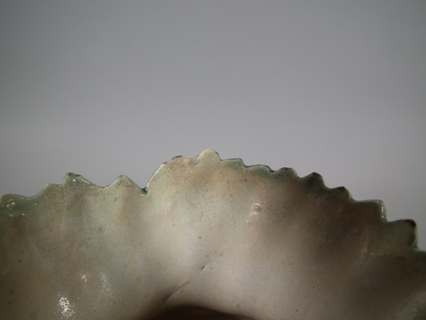 KILN EFFECTS: kiln grit caught in the glaze to the monkey and pineapple;