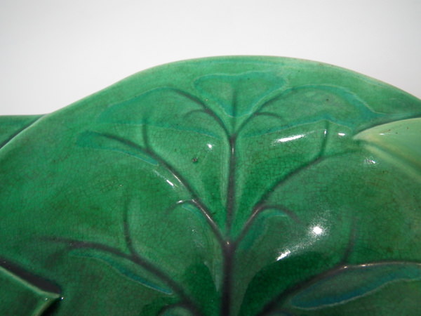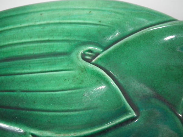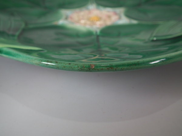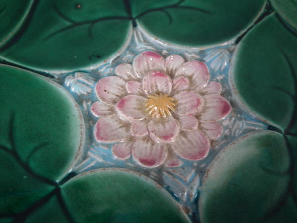 George Jones Majolica plate which features a pond lily flower surrounded by overlapping leaves. Colouration: green, pink, turquoise, are predominant.