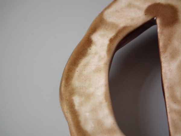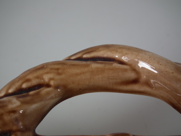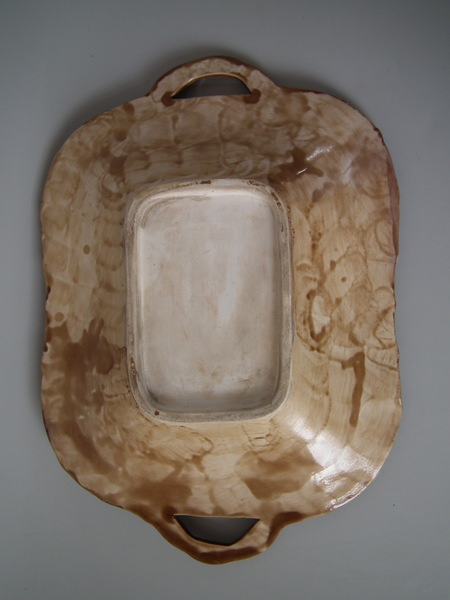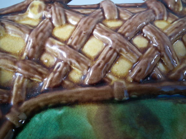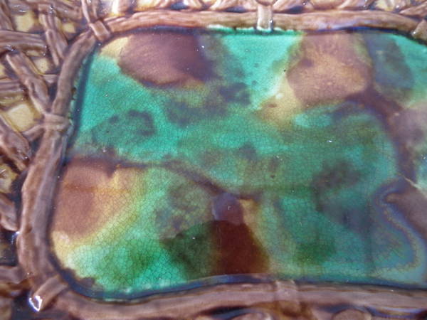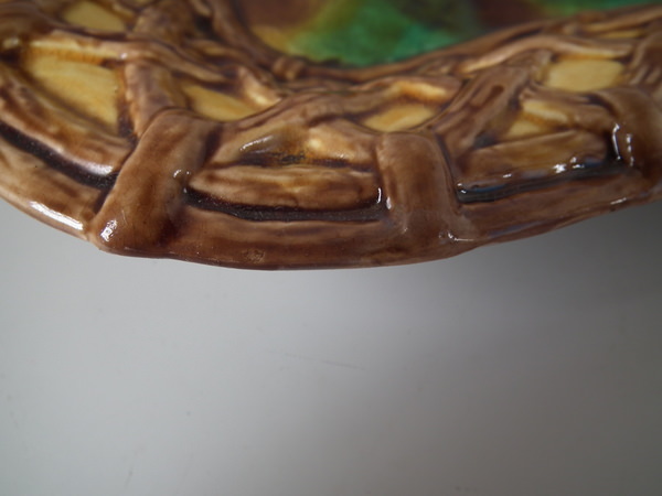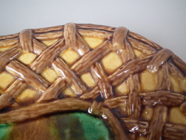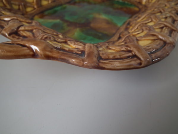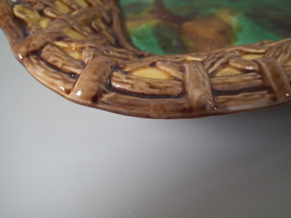 Victorian, circa 1870. 8.9ins high, 12.6ins wide, 2ins depth. Majolica platter which features a basket border with mottled centre.