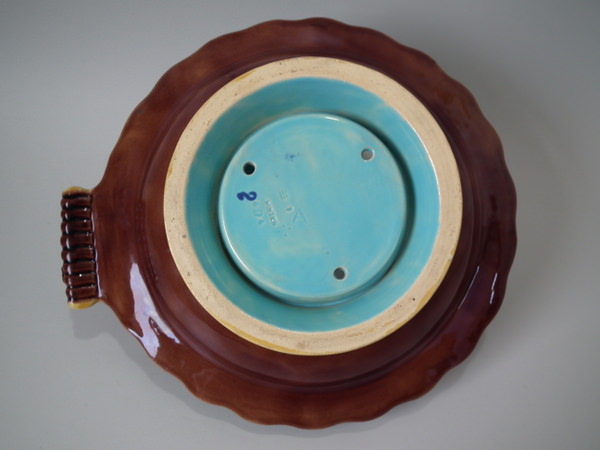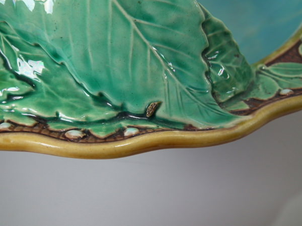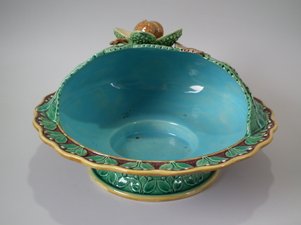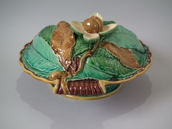 Victorian, circa 1865. 6.1ins high, 11ins wide, 9.4ins depth. Minton Majolica chestnut server which features chestnuts and chestnut leaves.