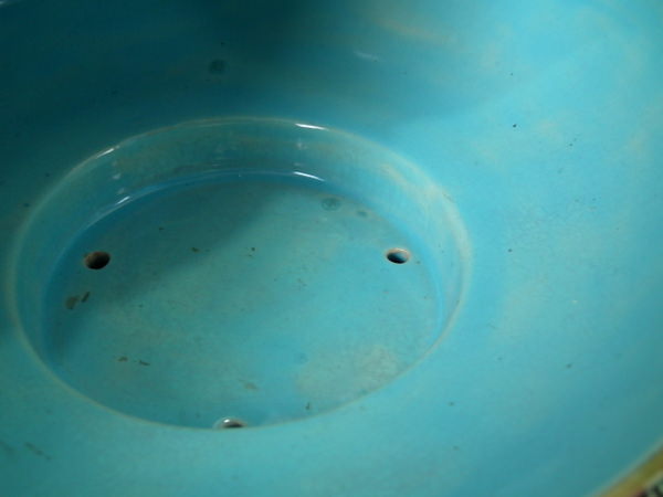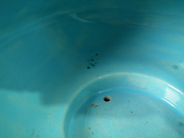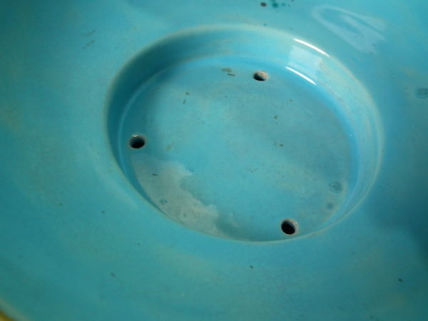 KILN EFFECTS: kiln grit caught in the glaze to one chestnut shell to top and one large leaf;