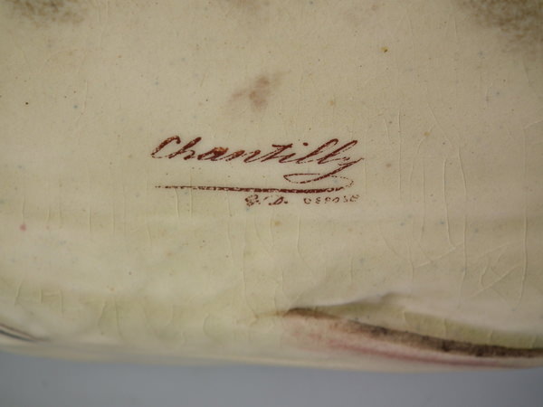 The piece bears maker's marks for the Chantilly pottery.