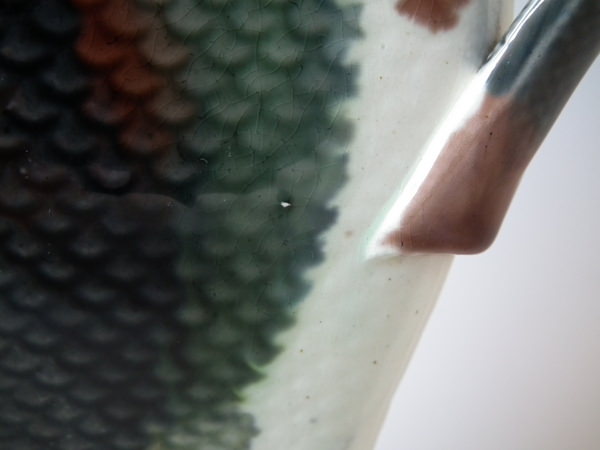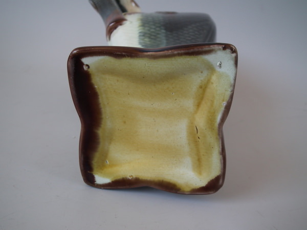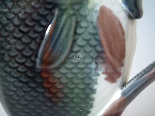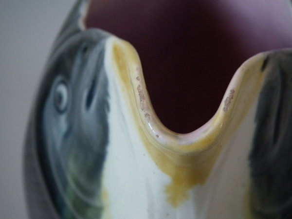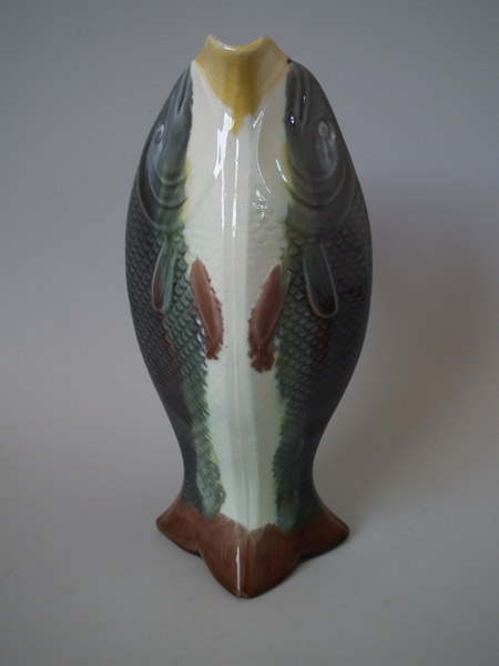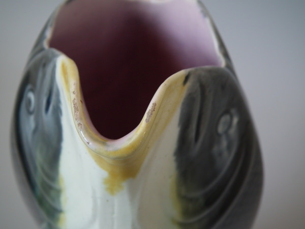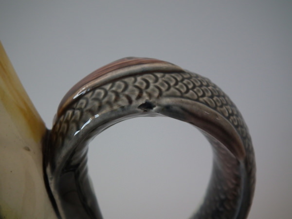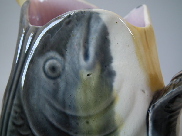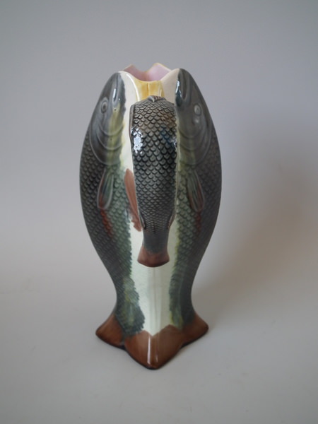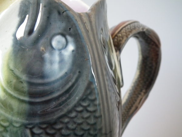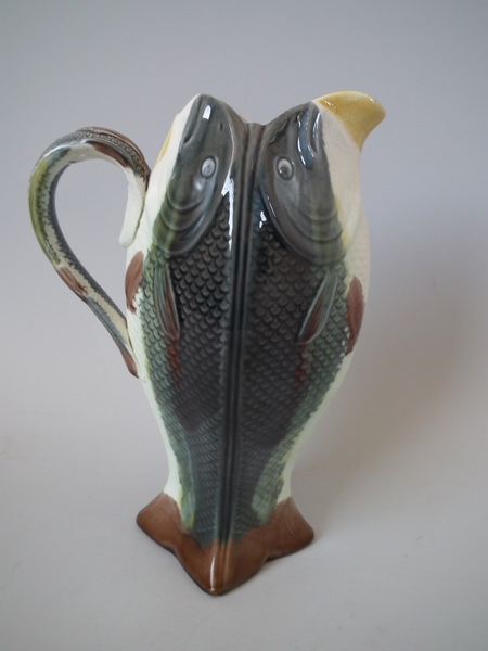 Victorian, circa 1880. 8.5ins high, 6.1ins wide, 3.9ins depth. Majolica jug/pitcher which features fish, one of which forms the handle.
