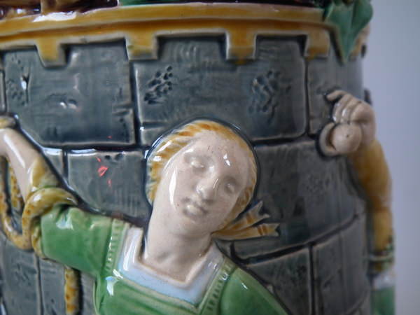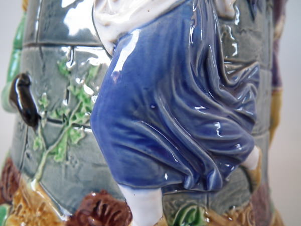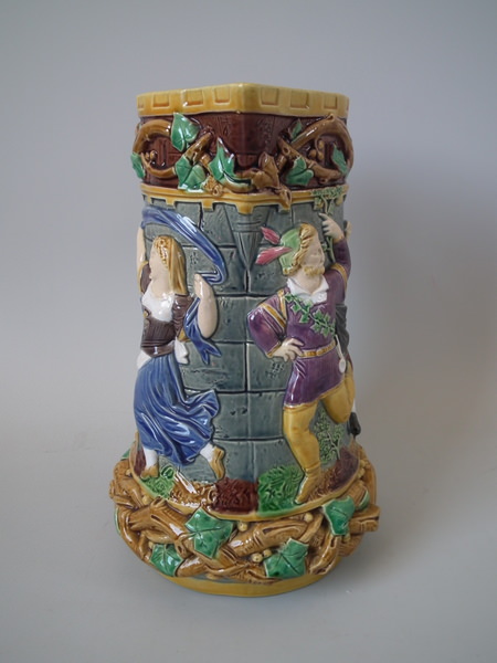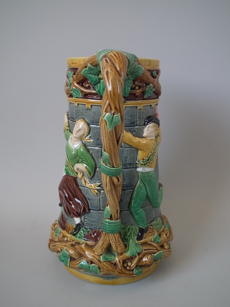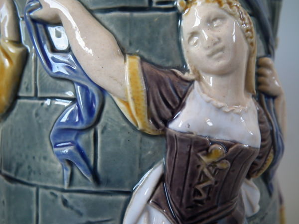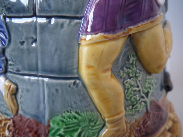 Victorian, circa 1868. 9.4ins high, 7.5ins wide, 5.5ins depth. Minton Majolica jug/pitcher which features dancing medieval figures.