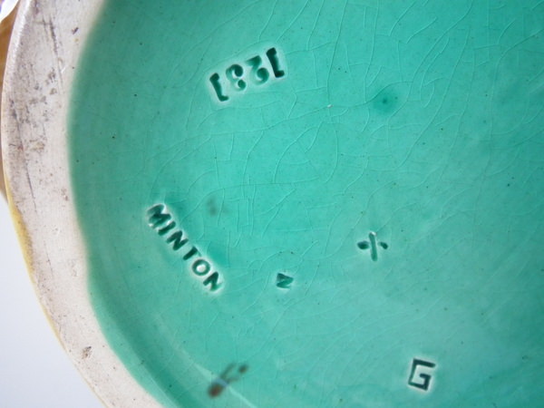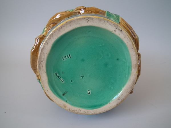 Colouration: green, ochre, purple, are predominant. The piece bears maker's marks for the Minton pottery.