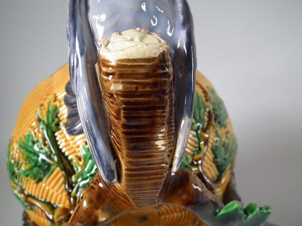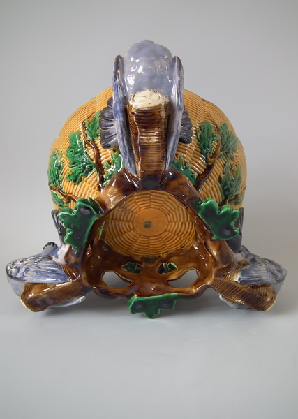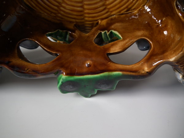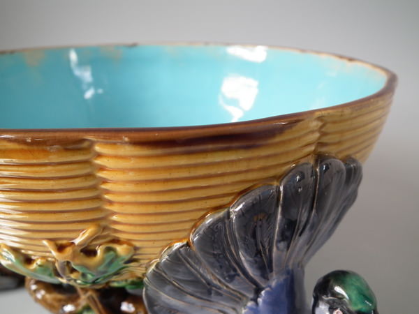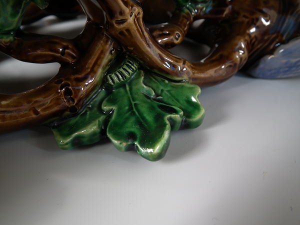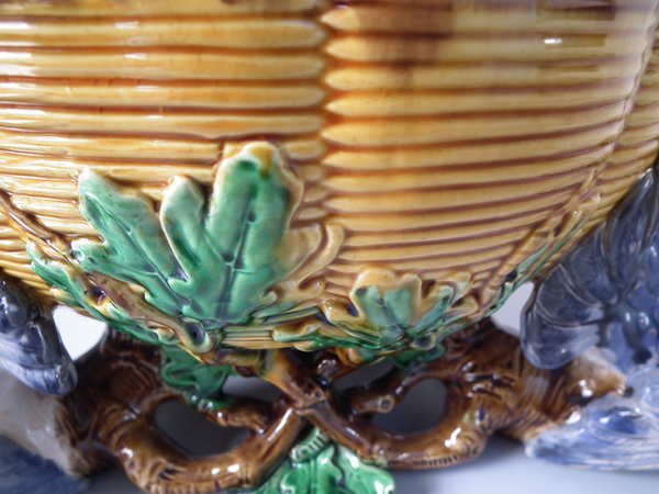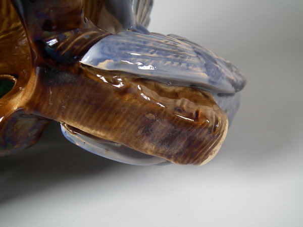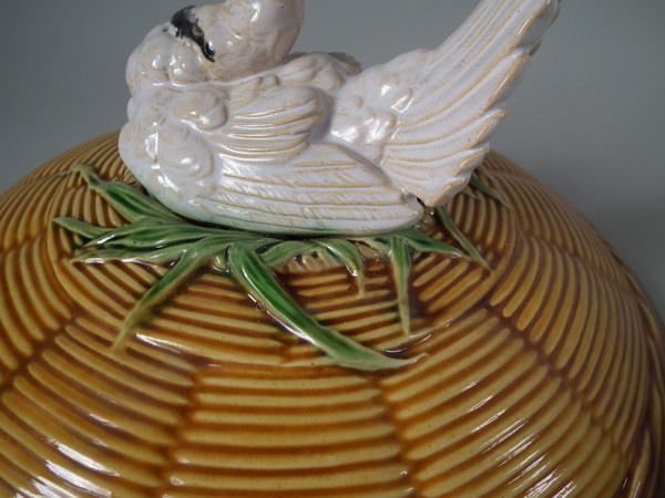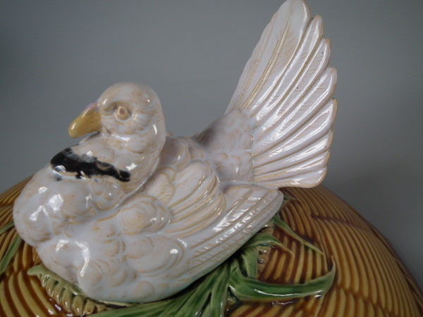 Victorian, circa 1870. 10.8ins high, 12.6ins wide, 11.8ins depth. Minton Majolica game pie dish which features pigeons.