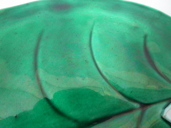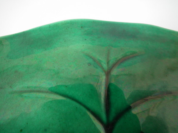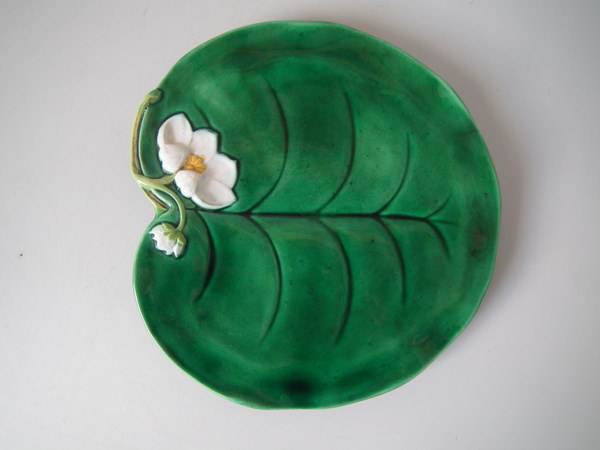 Victorian, circa 1873. 3.5ins high, 8.1ins wide, 0.8ins depth. George Jones Majolica plate which features a lily pad and flowers.