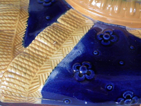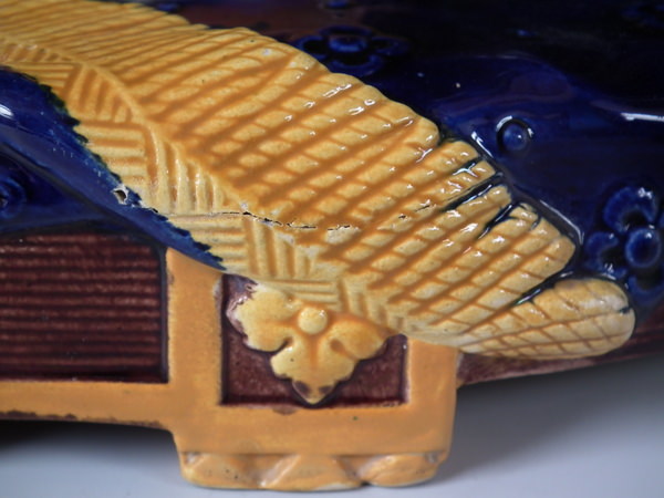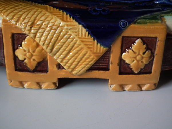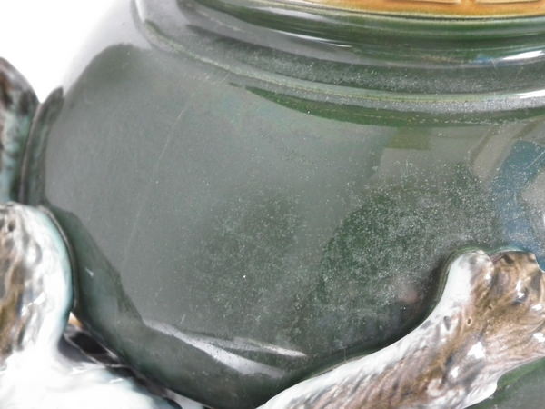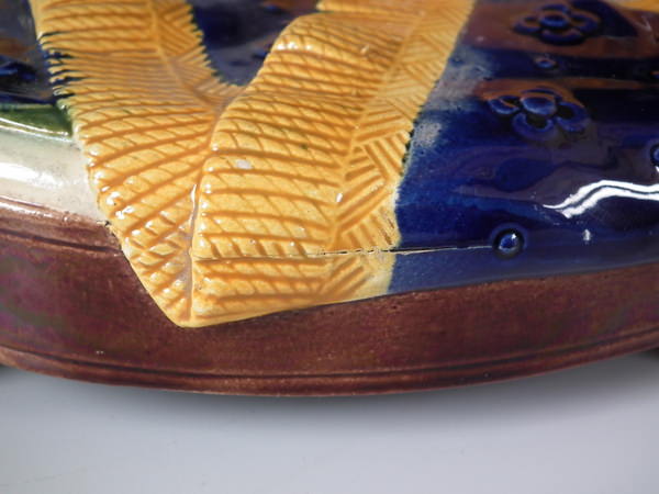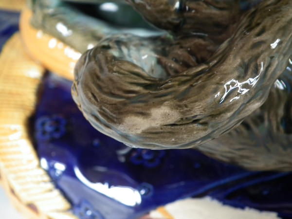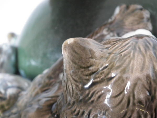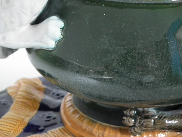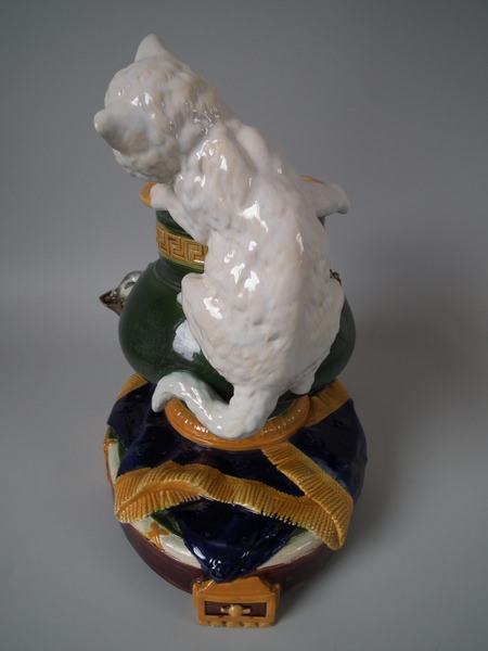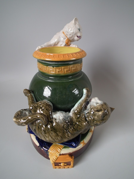Victorian, circa 1870. 11.2ins high, 10.6ins wide, 7.5ins depth. Brownfield Majolica vase which features two kittens playing with a vase, stood on a blanket. Colouration: ochre, green, cobalt blue, are predominant.