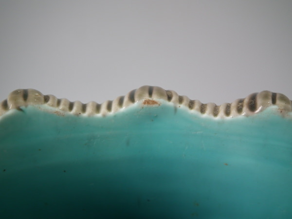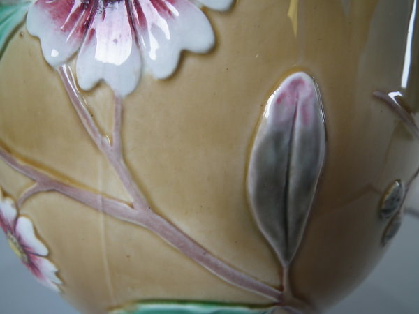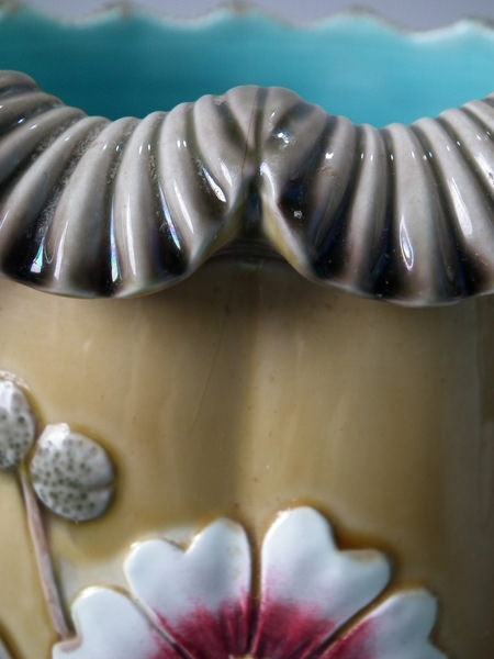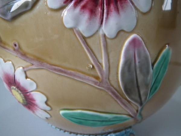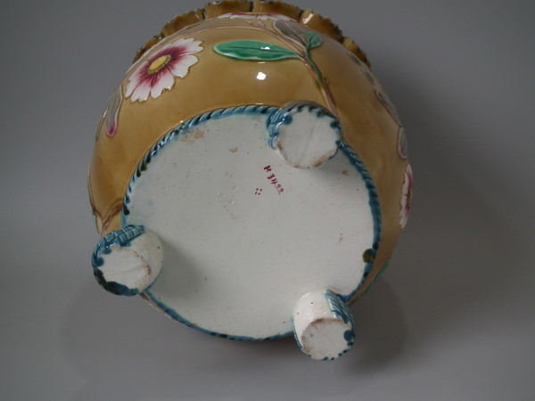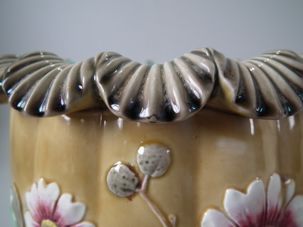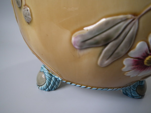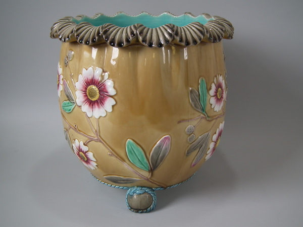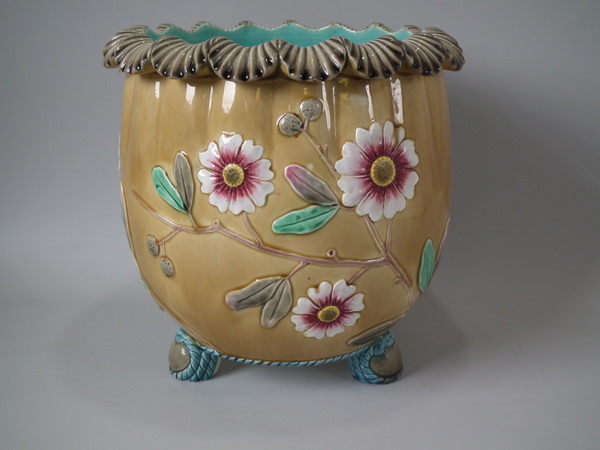 Victorian, circa 1884. 9.5ins high, 9.6ins wide, 9.6ins depth. Wedgwood Majolica jardinière which features flowering branches and three feet entwined with blue rope.