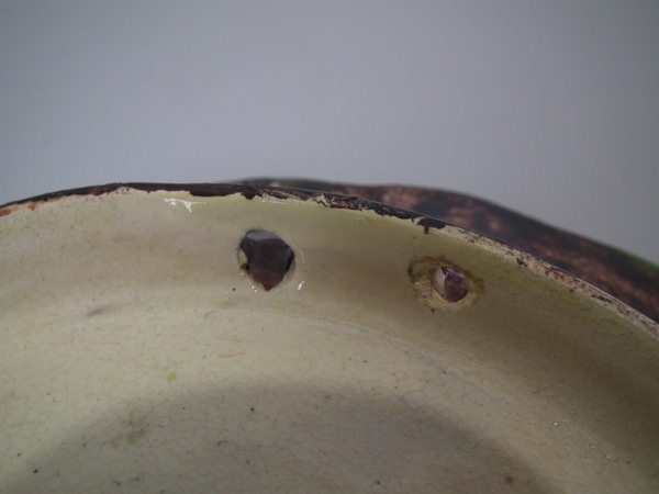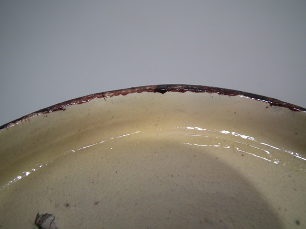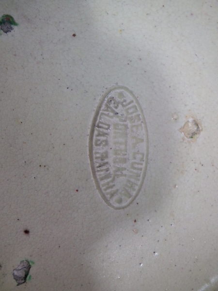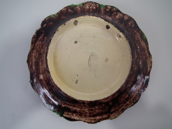 Scalloped rim. Colouration: green, brown, grey, are predominant. The piece bears maker's marks for the Cunha pottery.