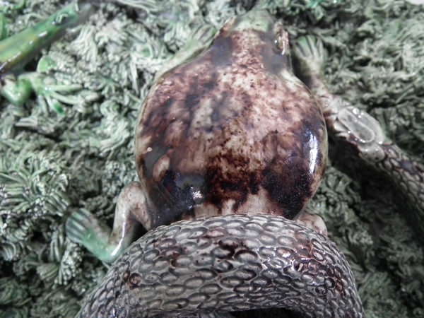 KILN EFFECTS: a few specks of kiln detritus caught in the glaze to the frog, snake and lizard.