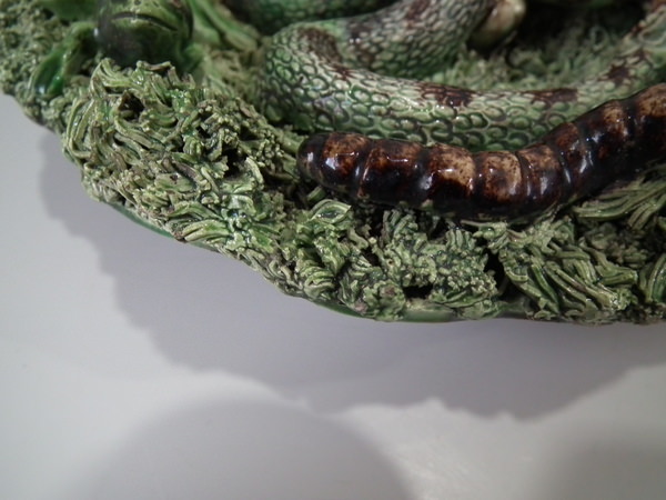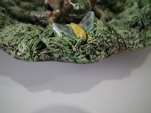 Victorian, circa 1890. 9.3ins high, 9.3ins wide, 2.4ins depth. Cunha Portuguese Palissy Majolica wall plate which features a toad with a snake over its back, surrounded by grubs, moths, a lizard and a frog.