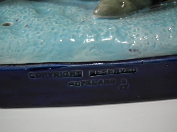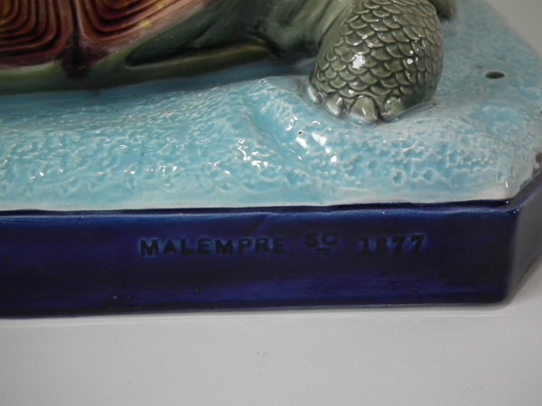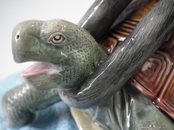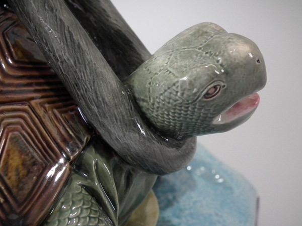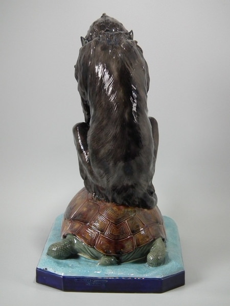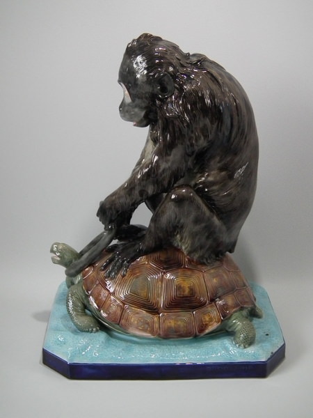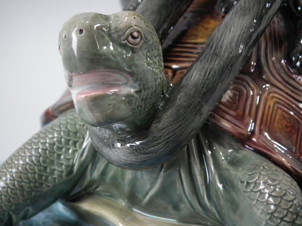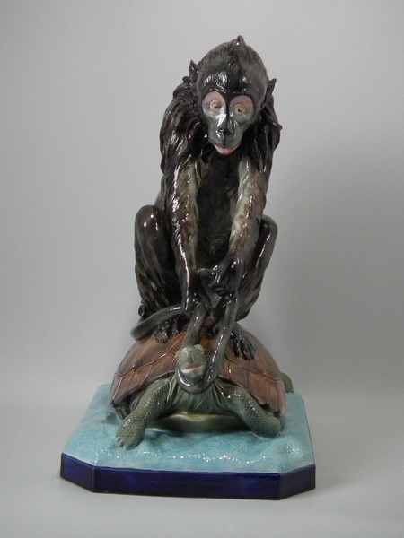 Victorian, circa 1877. 17.1ins high, 13ins wide, 9.5ins depth. Copeland Majolica figural which features a monkey riding on the back of a tortoise.