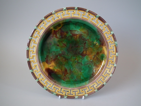 Wedgwood Majolica plate which features a Greek key reticulated border.