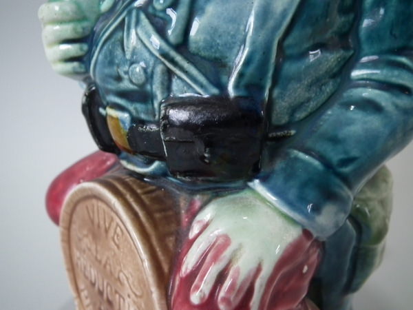 Victorian, circa 1900. 11ins high, 4.7ins wide, 6.3ins depth. Onnaing Majolica jug/pitcher which features a soldier sitting on a barrel, with the inscription 'VIVE LA REDUCTION DES PERIODES'.