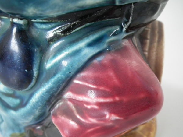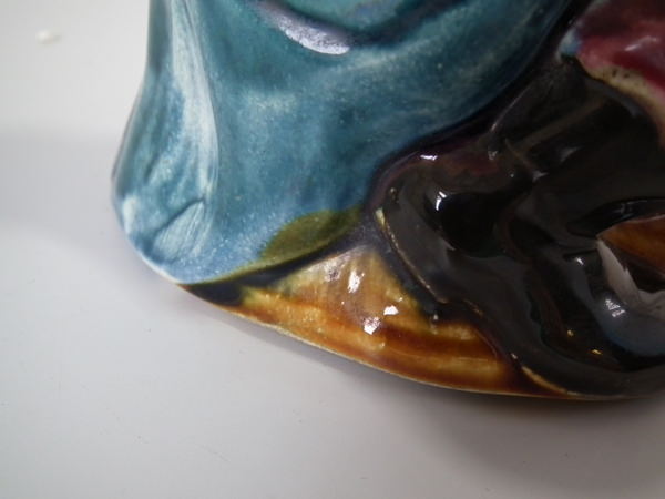 flecks of stray coloured glaze to his face and bag;