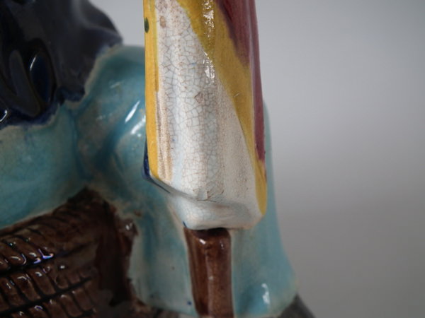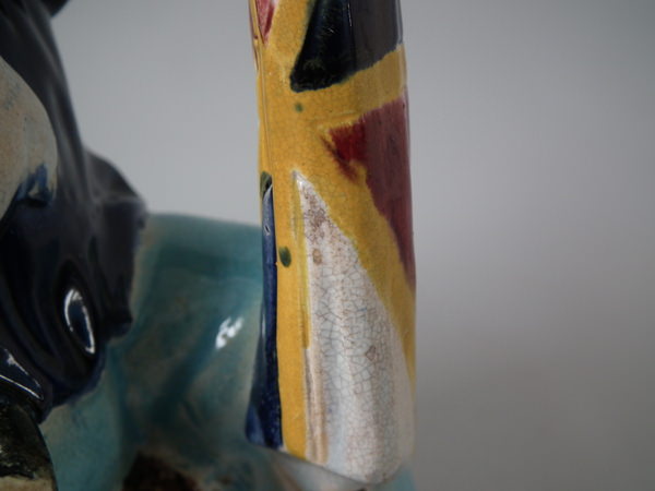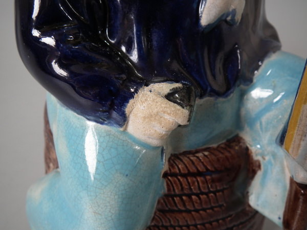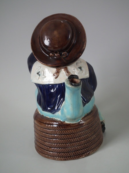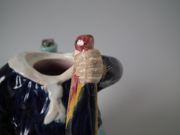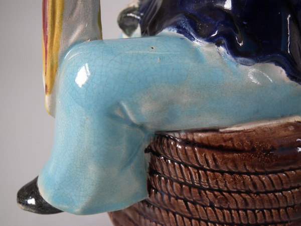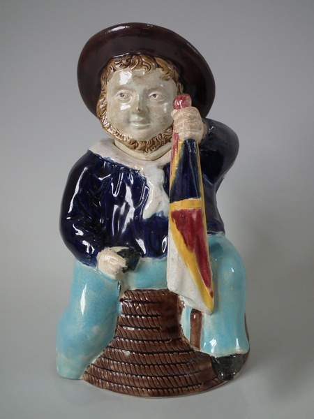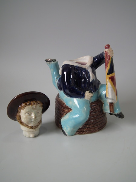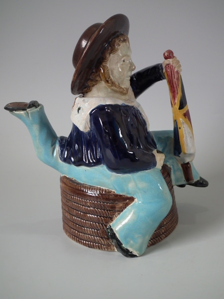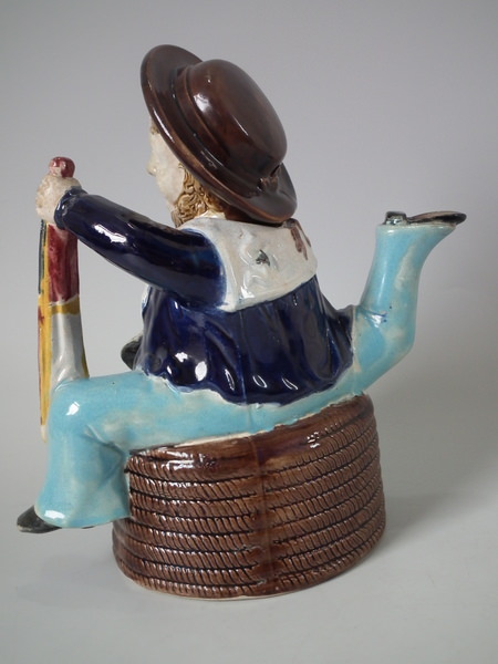 Victorian, circa 1870. 8.7ins high, 8.3ins wide, 5.1ins depth. Majolica teapot which features three legged bearded Manx sailor sitting on a coil of rope, holding a union jack flag, which forms the handle.