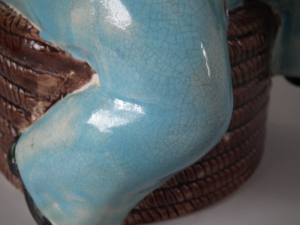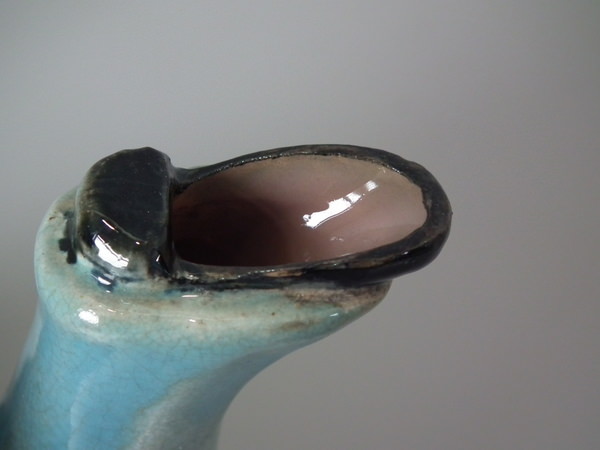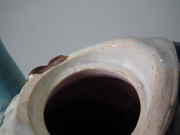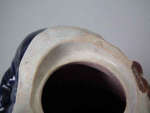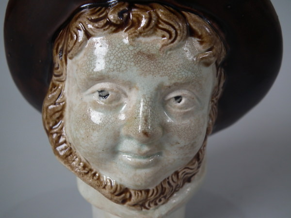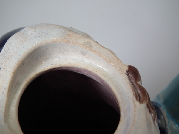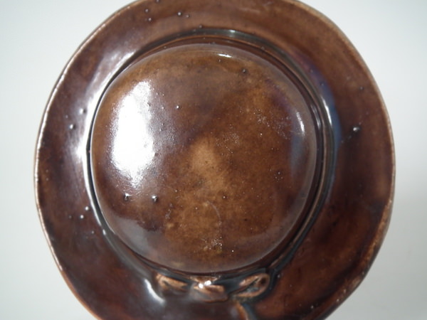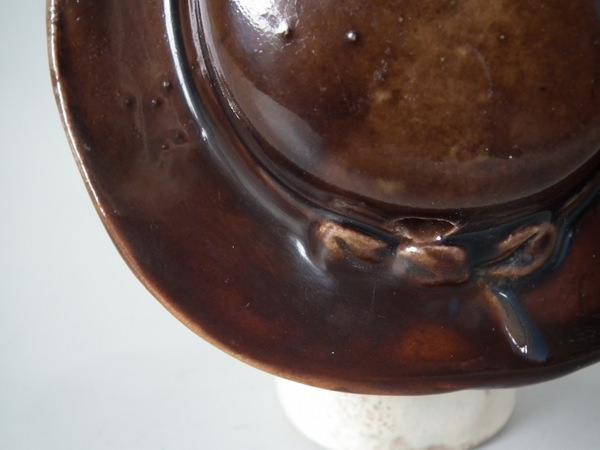 KILN EFFECTS: kiln detritus caught in the glaze to his hat;