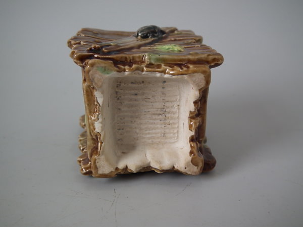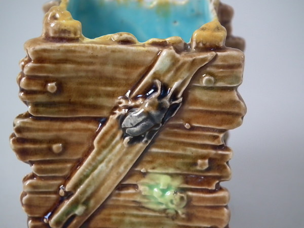 Victorian, circa 1870. 2.2ins high, 1.8ins wide, 1.4ins depth. George Jones Majolica match holder which features a beetle crawling up one side.