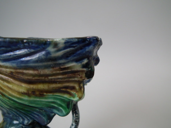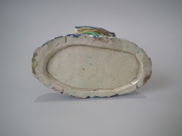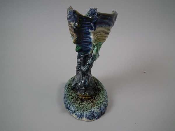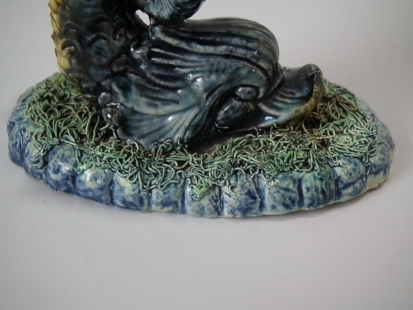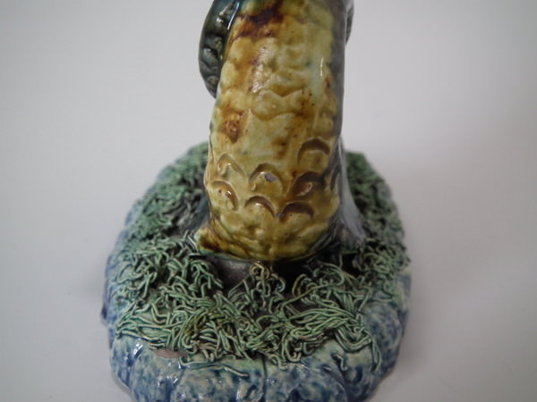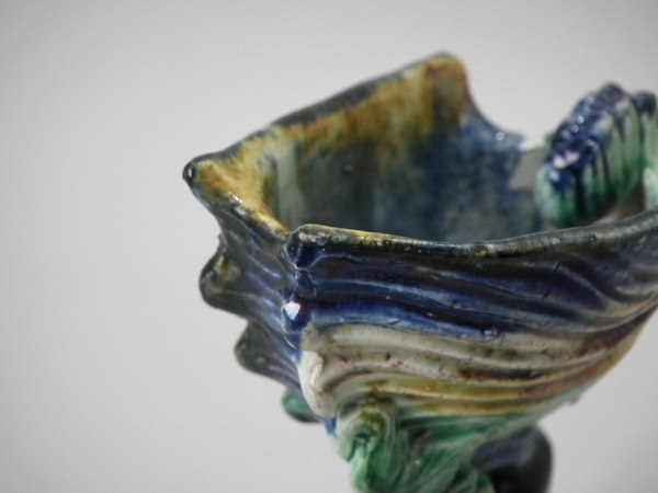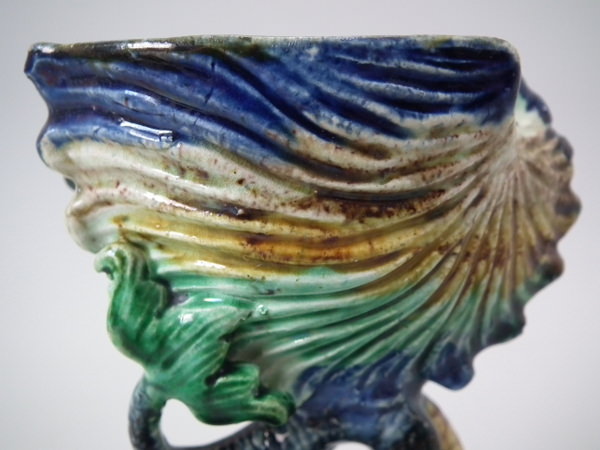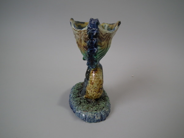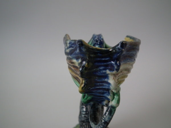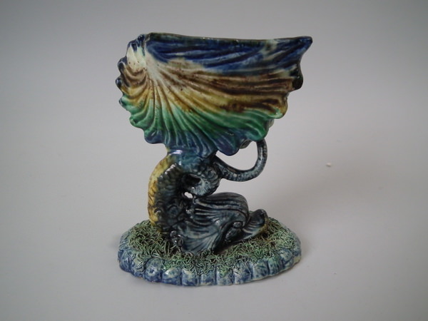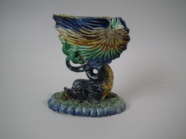 Victorian, circa 1890. 4.1ins high, 3.8ins wide, 2.2ins depth. French Palissy Majolica salt which features a dolphin holding a shell with it's tail.