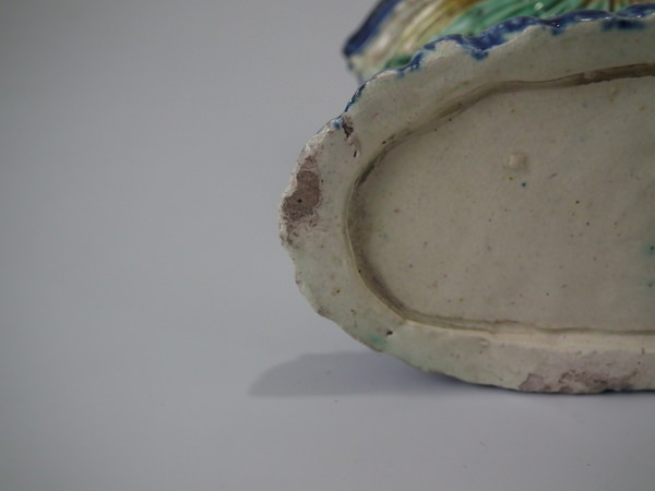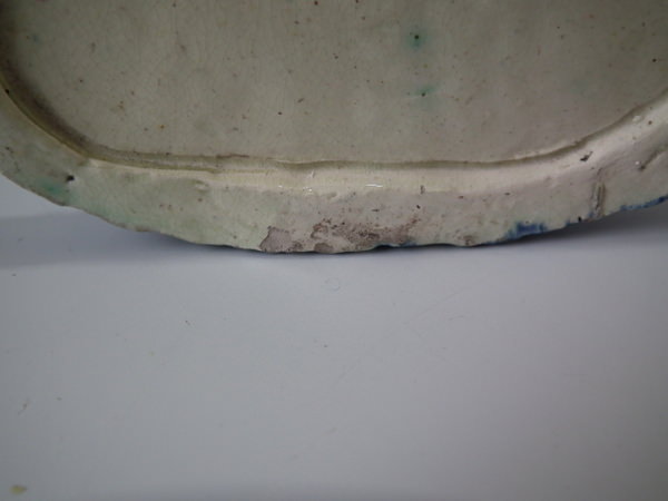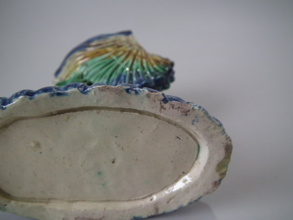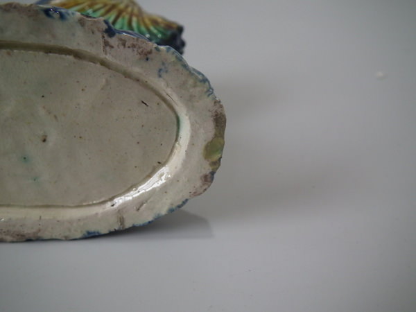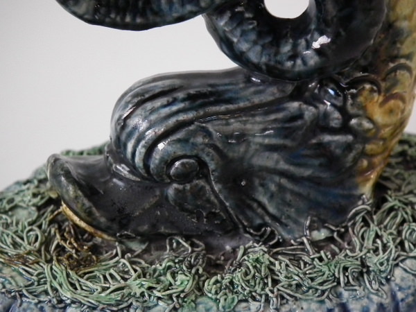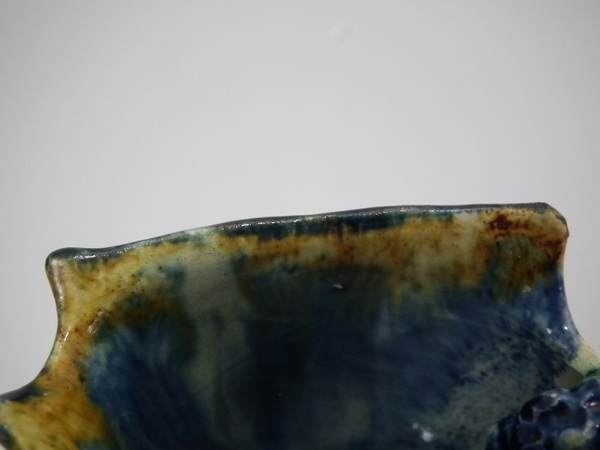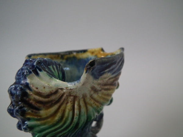 KILN EFFECTS: kiln detritus caught in the glaze to the dolphin and shell.