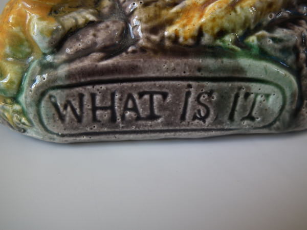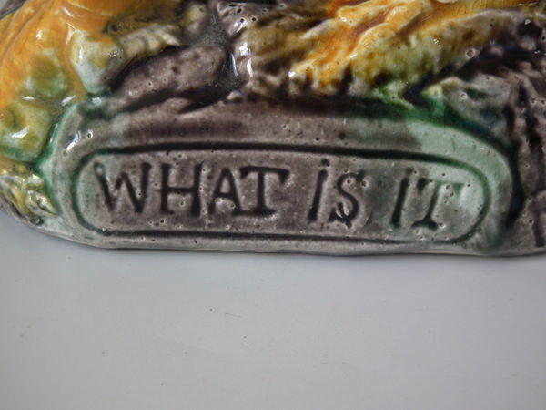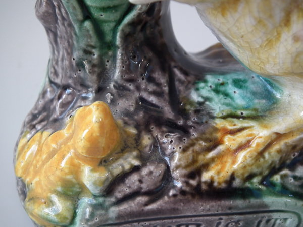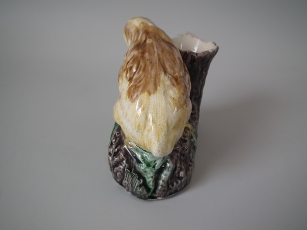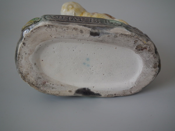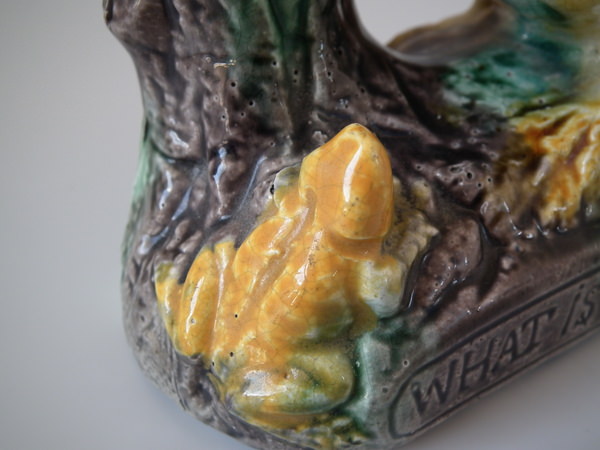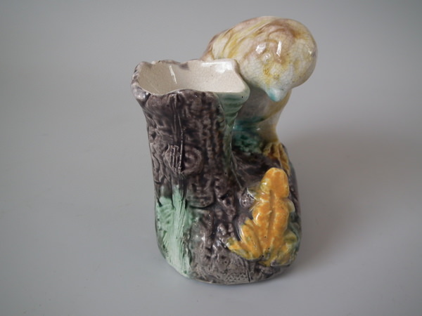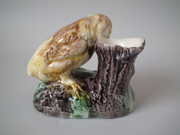Victorian, circa 1880. 3.7ins high, 4.5ins wide, 2.4ins depth. Majolica toothpick holder which features a chick staring down at a frog.