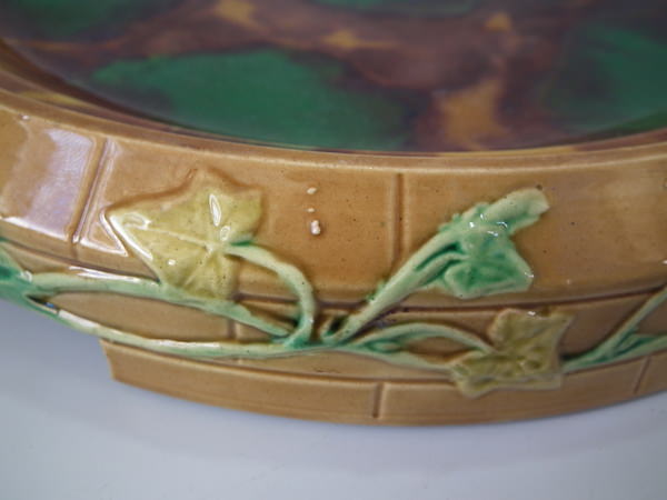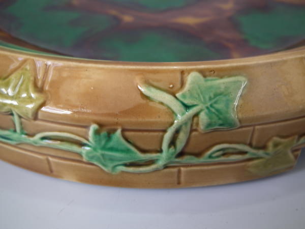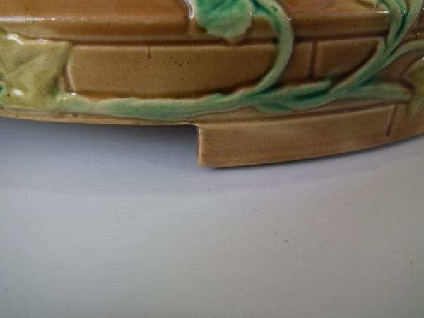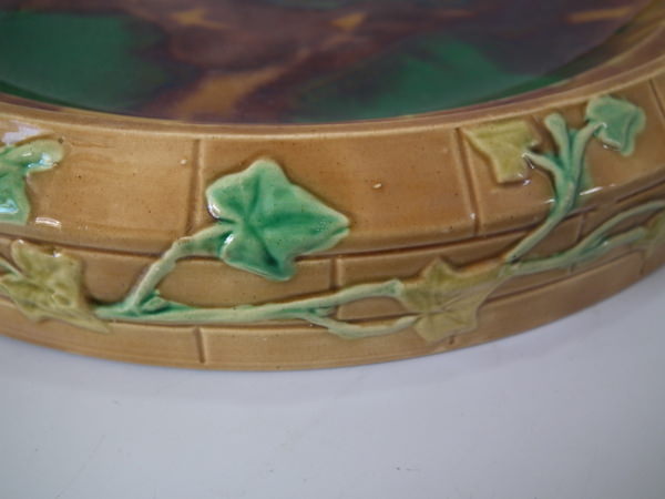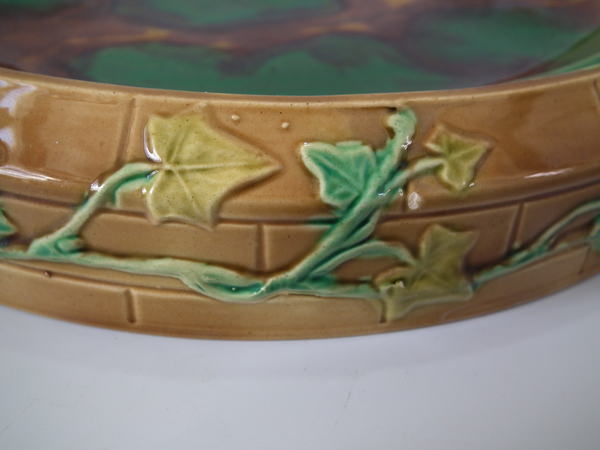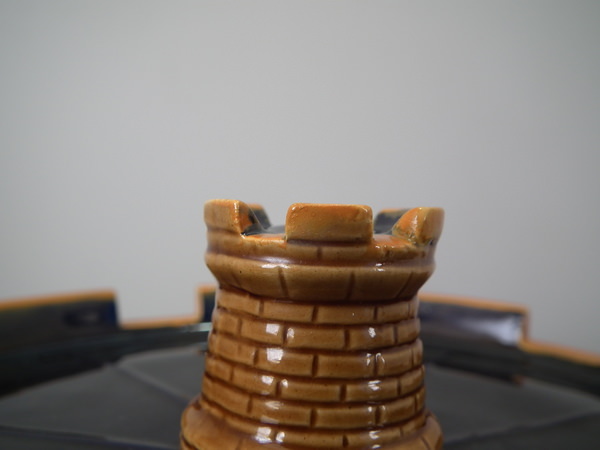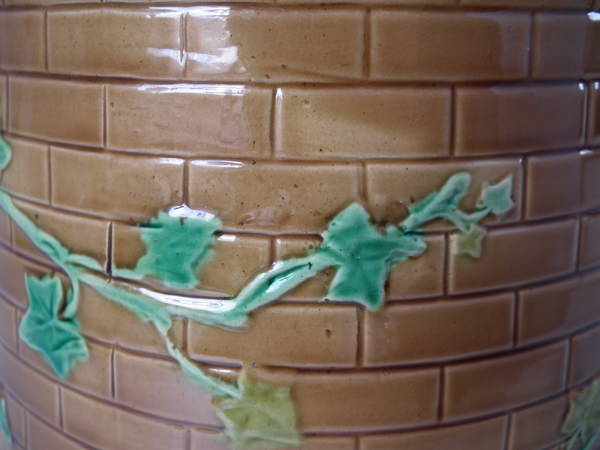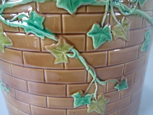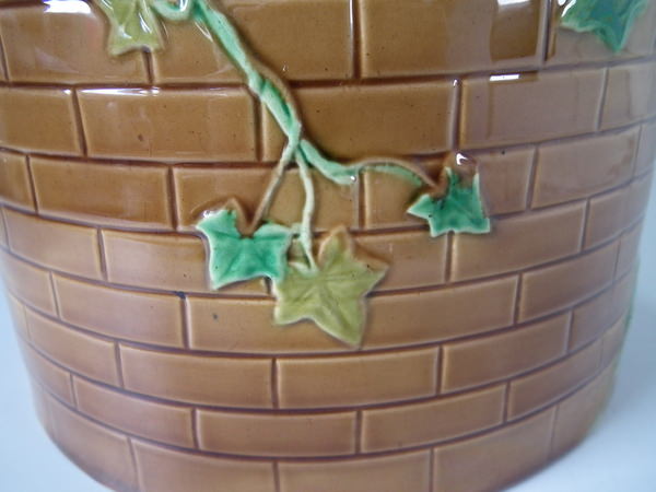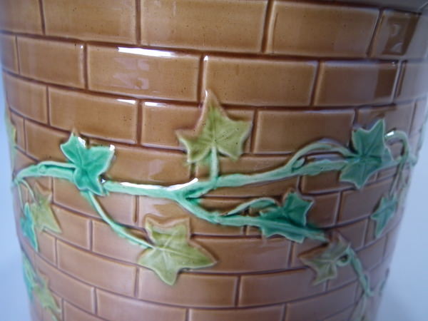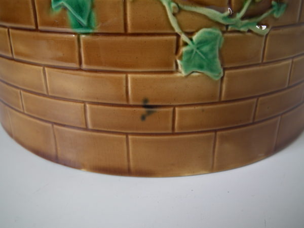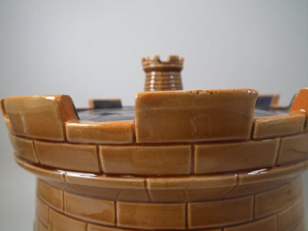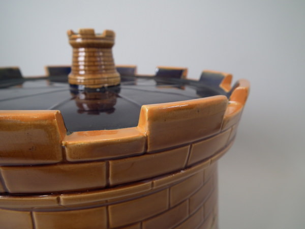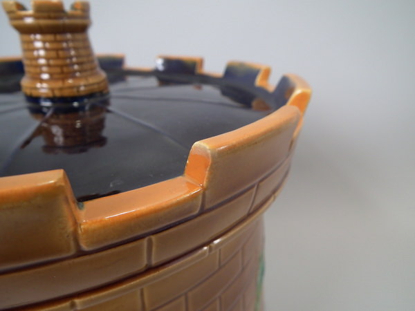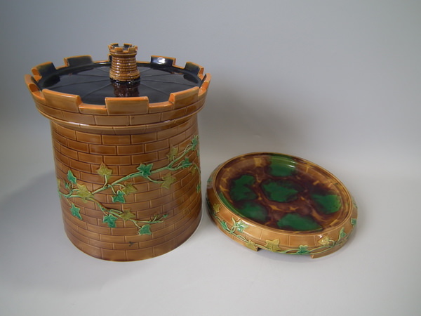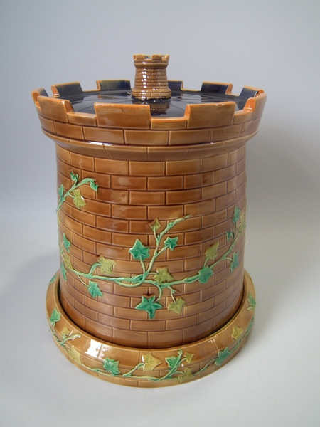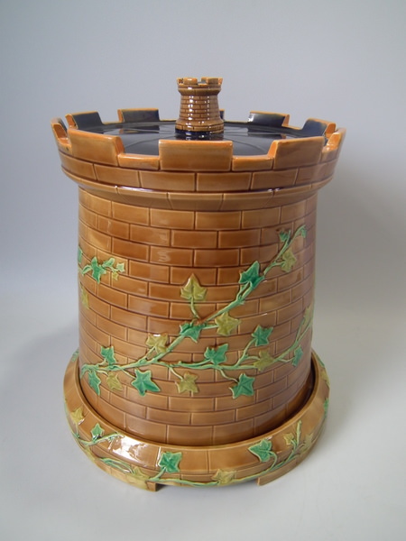 Victorian, circa 1870. 11.8ins high, 10.2ins wide, 10.2ins depth. Brownfield Majolica cheese keep which features a castle tower with ivy trailing up the sides.