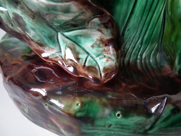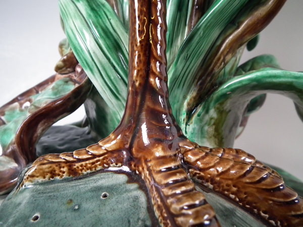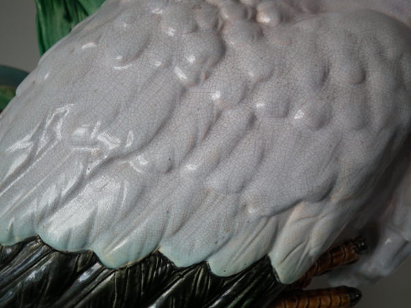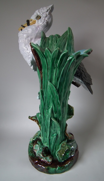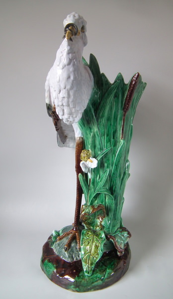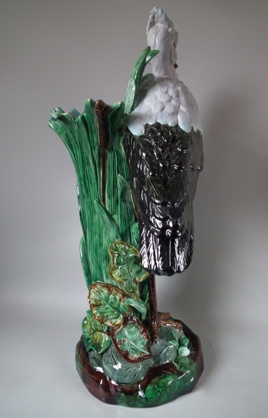 Victorian, circa 1870. 32.7ins high, 17.7ins wide, 12.6ins depth. Holdcroft Majolica stick or umbrella stand which features a stork stood besides bulrushes with a snake wrapped around it's beak.