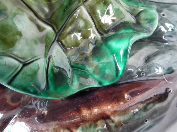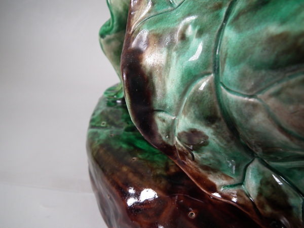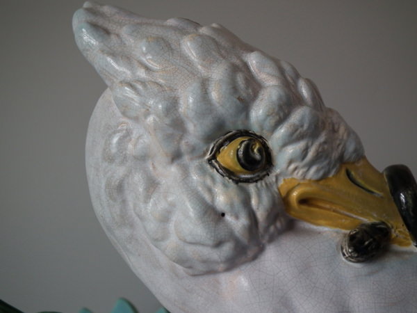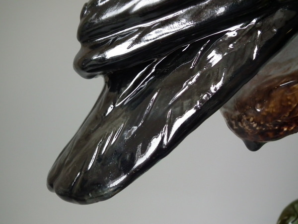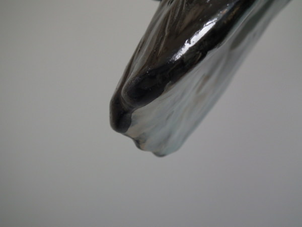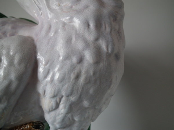 RESTORATION: Tail feathers and tip of bulrush leaf reglued and joins retouched.