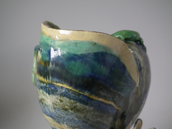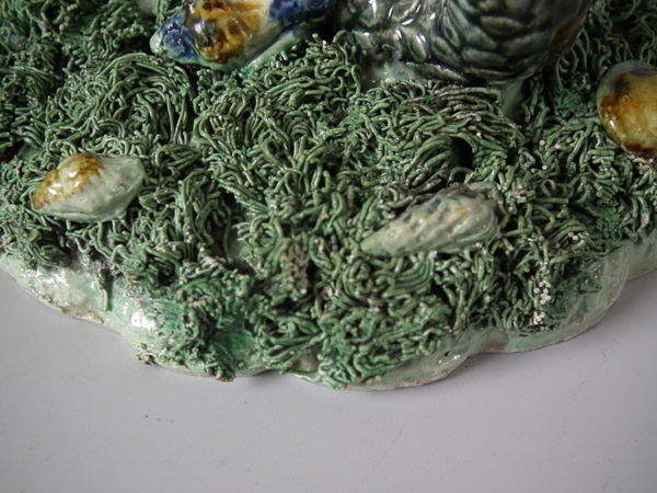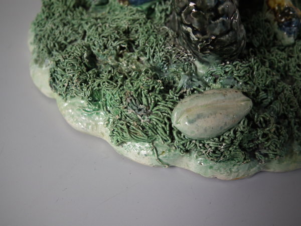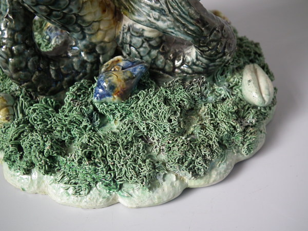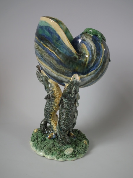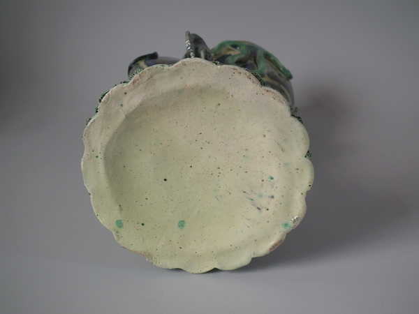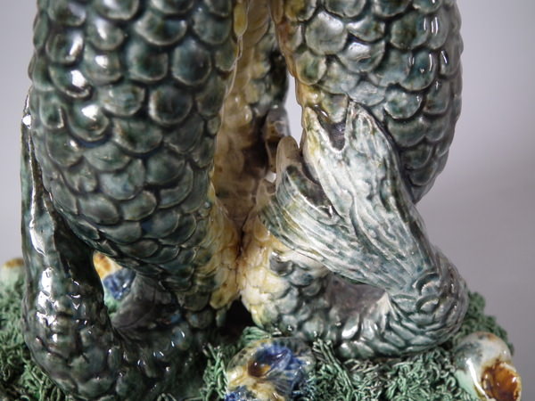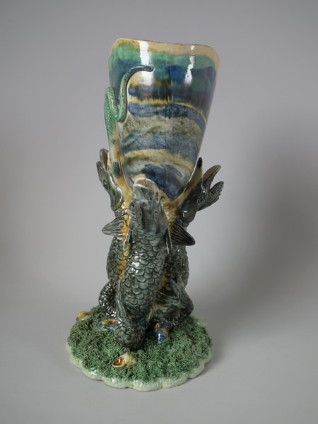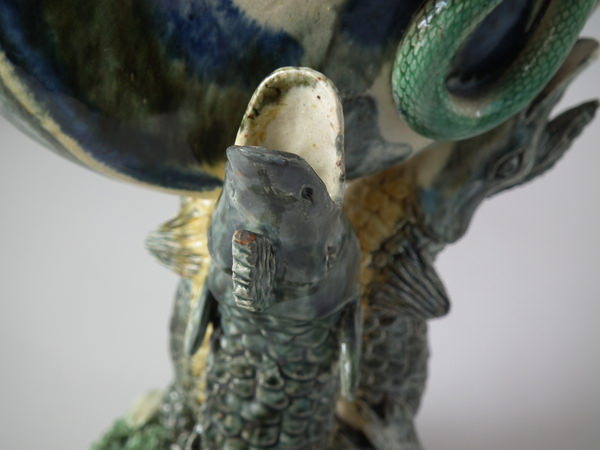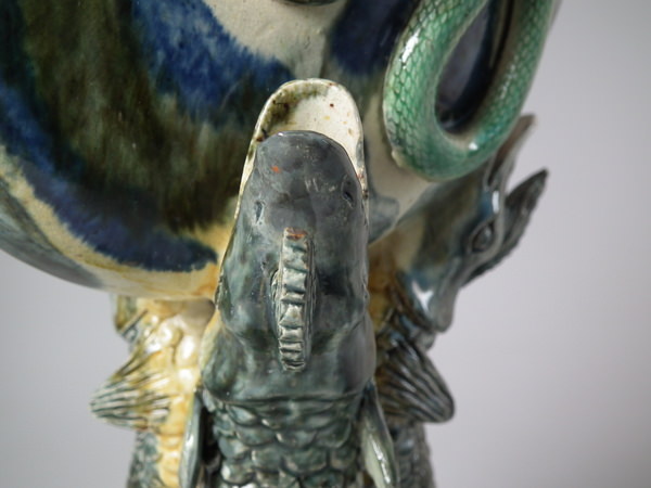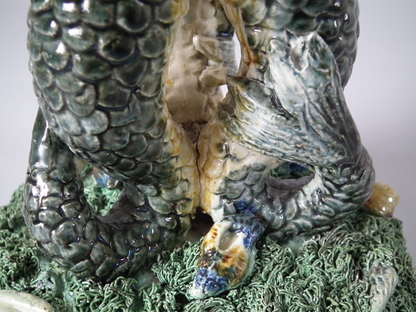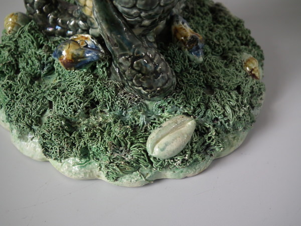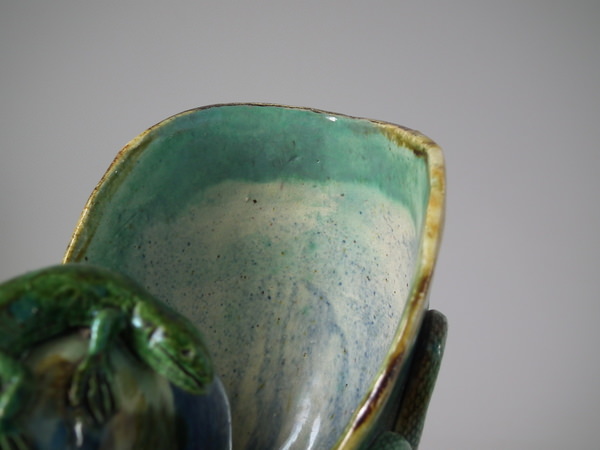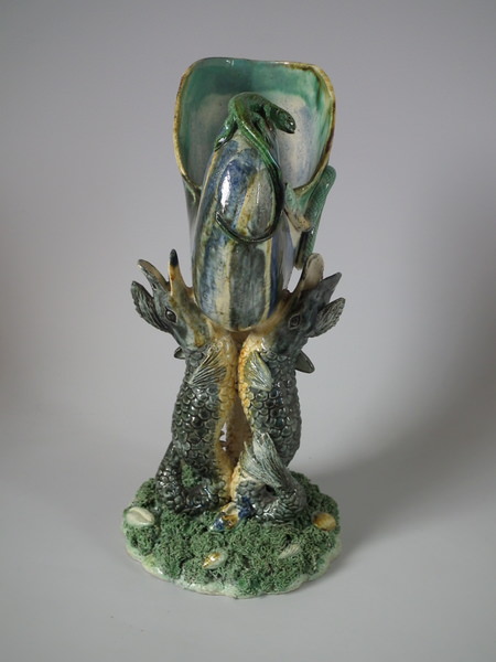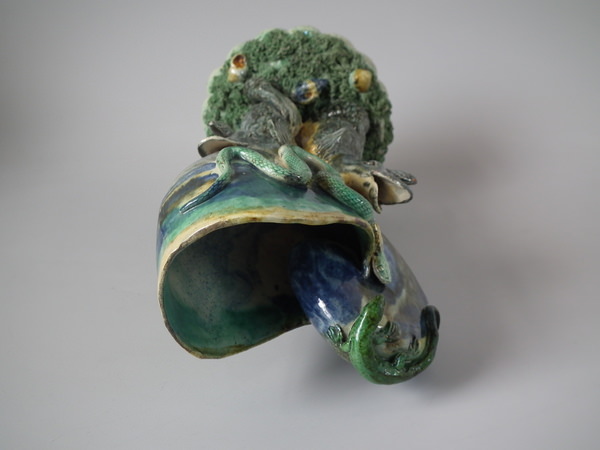 Victorian, circa 1890. 10.2ins high, 5.5ins wide, 5ins depth. Palissy Majolica vase which features a small lizard and snake resting on a nautilus shell,