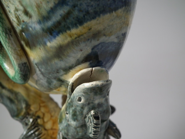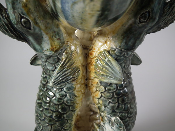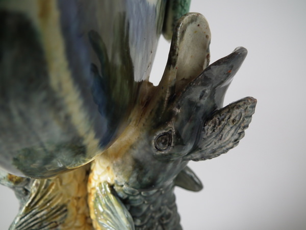 one fish's upper jaw and both dorsal fins reglued and joins retouched;