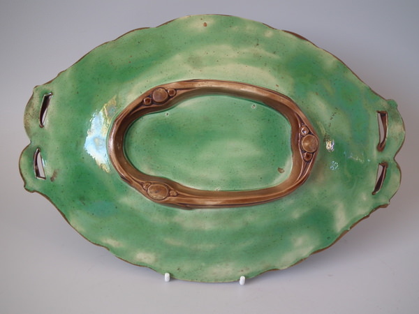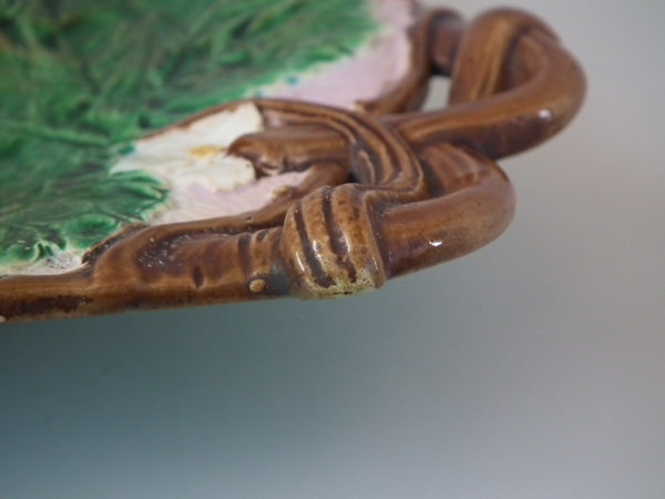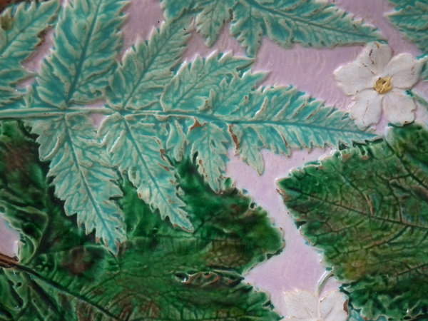 Holdcroft Majolica platter which features fern fronds and white flowers with a branch effect molded foot rim.