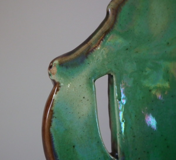 KILN EFFECTS: a speck of kiln detritus caught in the glaze to one leaf;