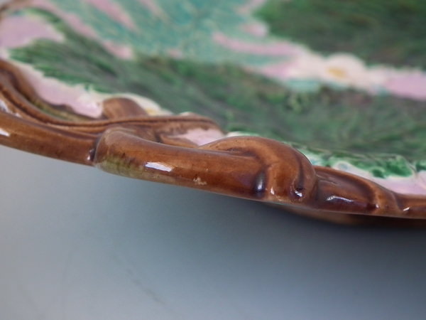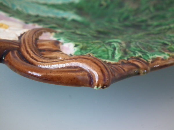 Holdcroft Majolica platter which features fern fronds and white flowers with a branch effect molded foot rim.
